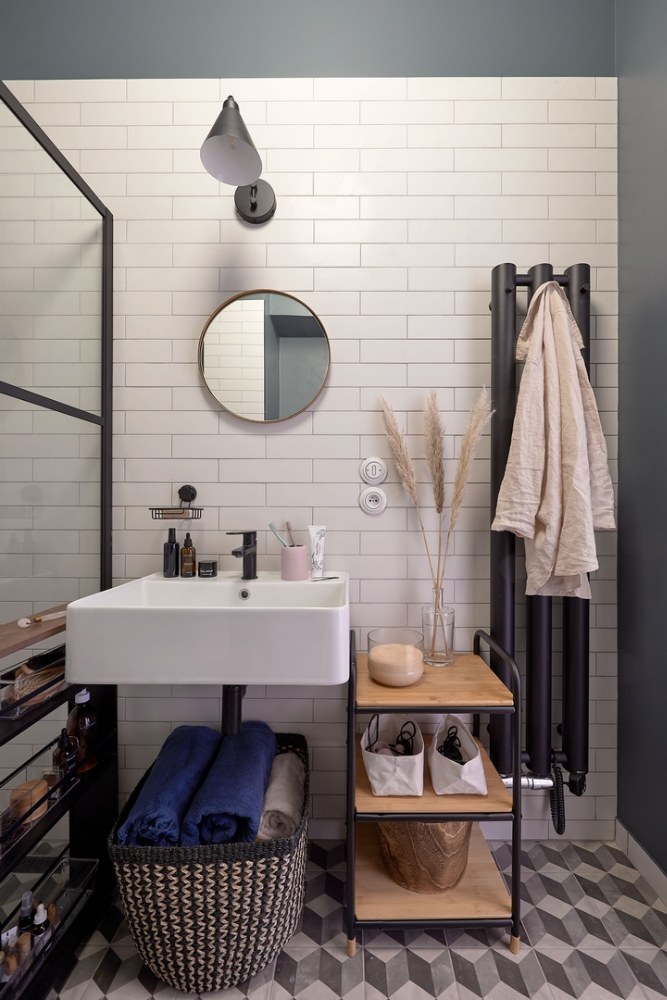 Vzhledem k tomu, že koupelně dominuje výrazná dlažba, zvolila Markéta doplňky už jen v tlumených neutrálních barvách a matném provedení. Industriální nádech však vnesl do interiéru například stylový držák na ručníky a osvětlení.