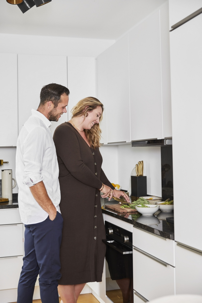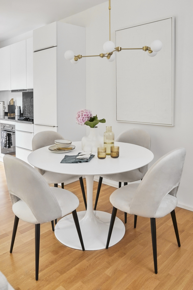 „Moje oblíbená místnost je otevřený obývací prostor s kuchyní, protože ráda vařím. Užívám si roli hostitelky, takže se nemůžu dočkat, až pozvu všechny své přátele a něco jim uvařím. Vzhledem k prostoru jsme se rozhodli pořídit si kulatý stůl. Židle Rachel jsme měli už ve starém bytě. Jsou super pohodlné a přesunuli jsme je sem v odlehčené verzi. Pro nás je tato kombinace dokonalým řešením.“