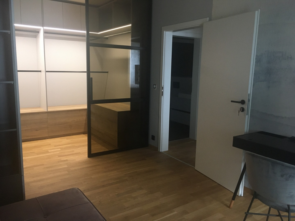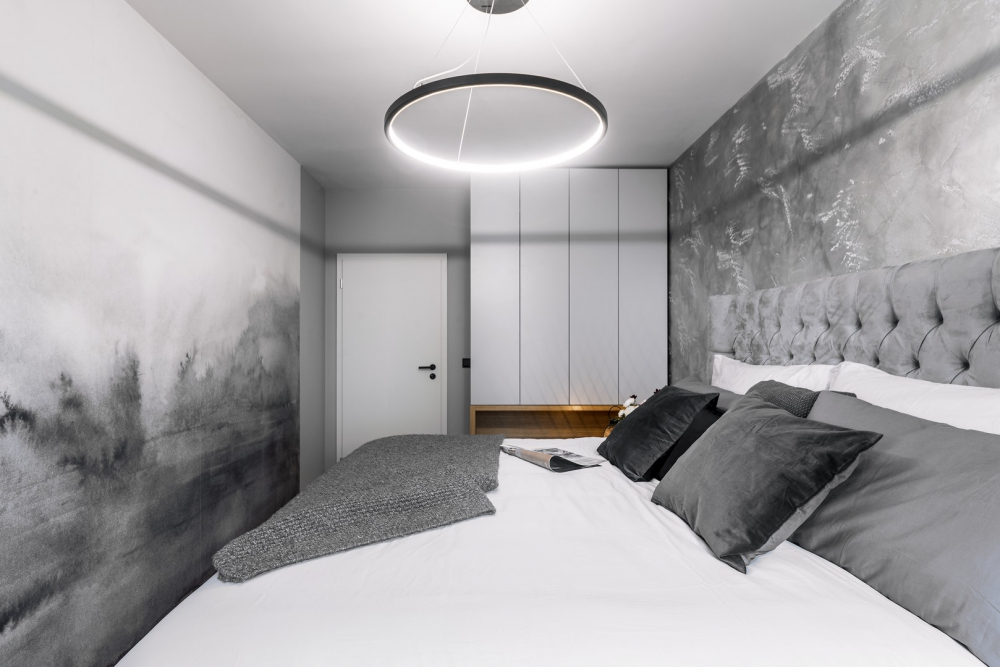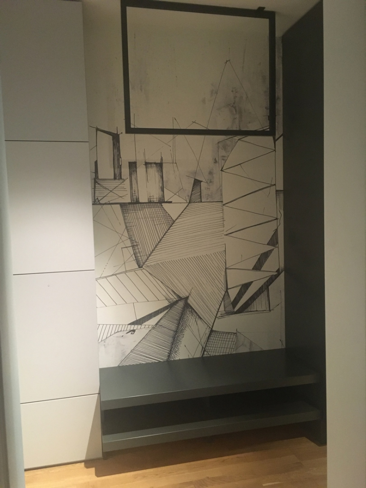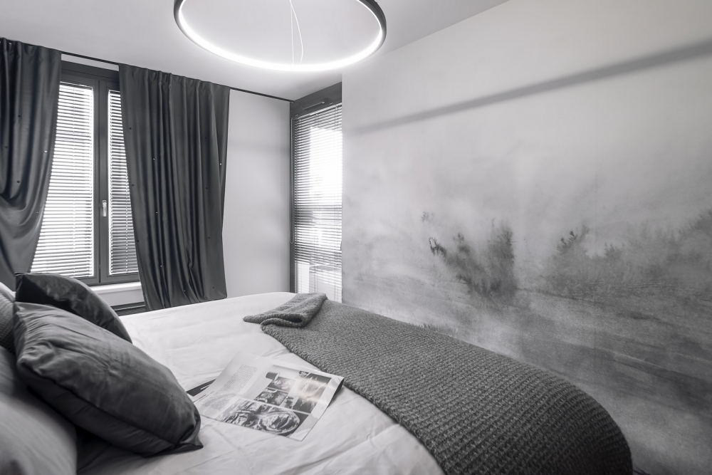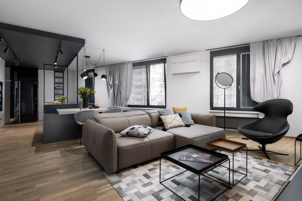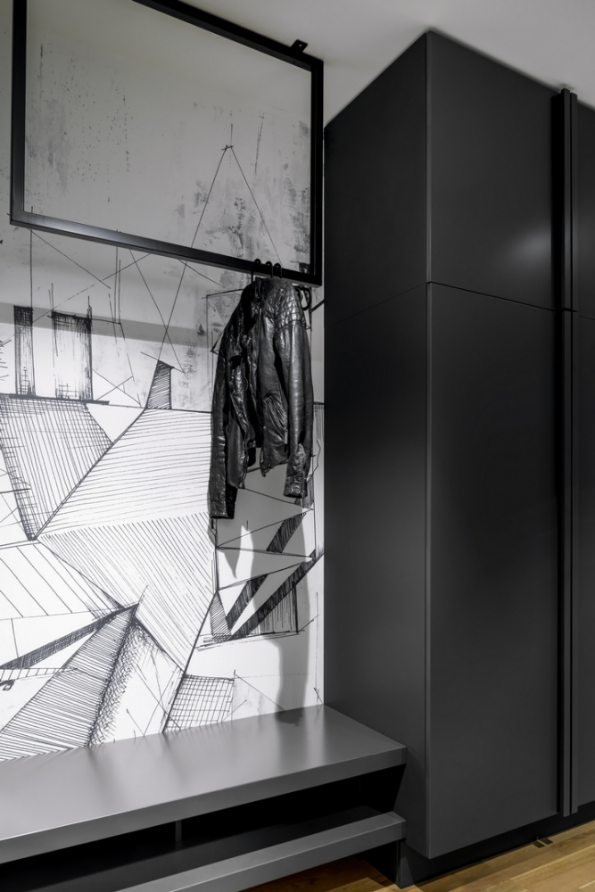 Designérka navrhla poměrně hodně úložných prostorů na míru v rámci celého interiéru, čímž využila cenné centimetry a umožnila bytu ponechat si minimalistický ráz. Kvůli psům nesměly být na oknech žádné textilie, ale designérka chtěla interiér lehce „změkčit“ a zároveň nechtěla vytvářet „oponu“ přes celá okna, proto navrhla splývavý závěs s patenty umožňujícími závěs kdykoli zkrátit a příjemným výsledným efektem.