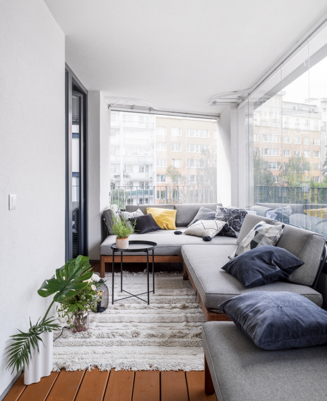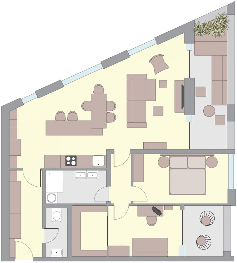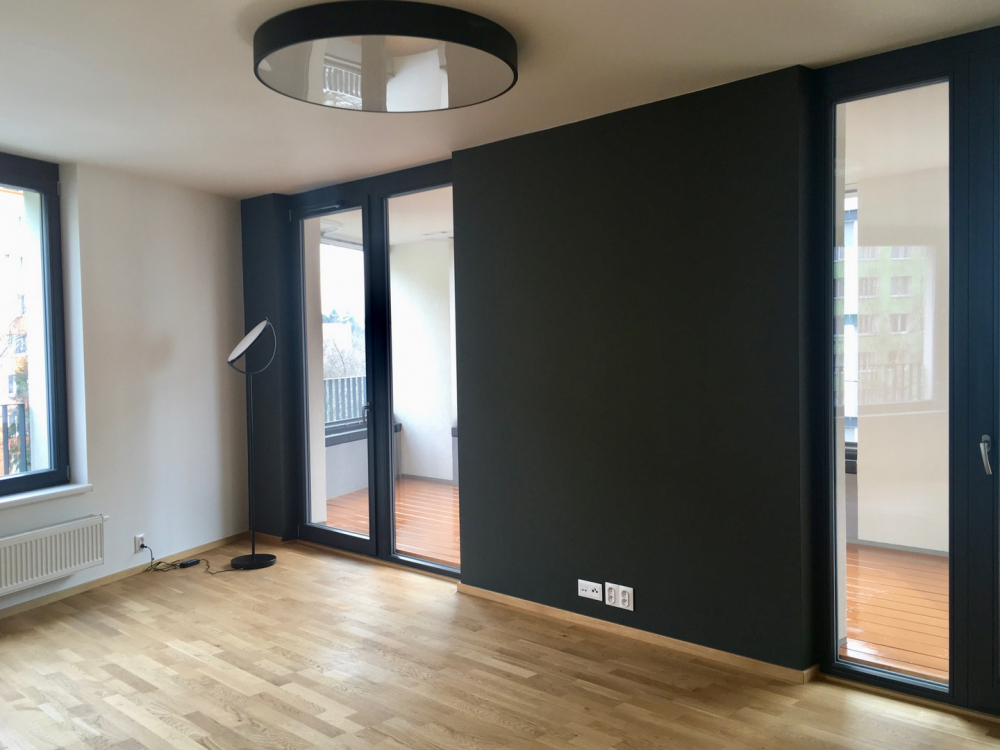 Příjemnou dispozici nového bytu 3 + kk, který si bezdětní manželé po návratu ze zahraničí pořídili, designérka velmi ocenila. Byt má striktně rozdělené zóny na společenskou, skýtající chodbu, toaletu, obytný prostor se vstupem na prosklenou terasu, a soukromou s menší chodbičkou, koupelnou a dvěma pokoji.