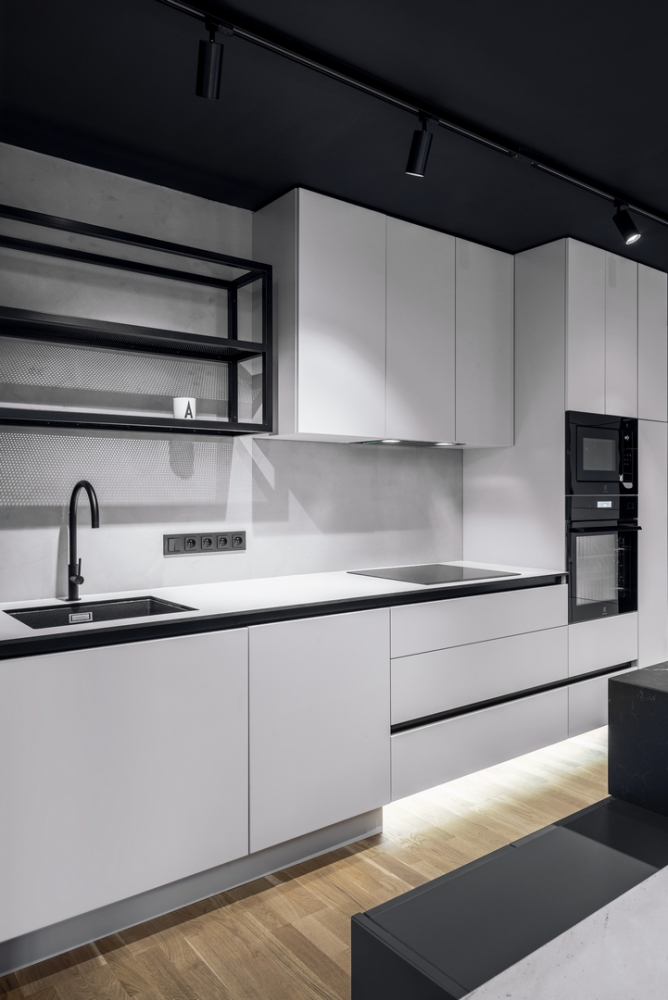 Skvělou volbou se ukázaly rampy s bodovými světly, které jsou i v předsíni. Díky návrhu ostrůvku, do kterého vede kovovou konstrukcí elektroinstalace, protože ji nebylo možné vést již položenou podlahou, vznikla prostorná kuchyně s jídelním stolem. Řešení stolu, který je částečně položený na snížené části ostrůvku, umožnilo dostatečný průchod mezi obývací a kuchyňskou částí.