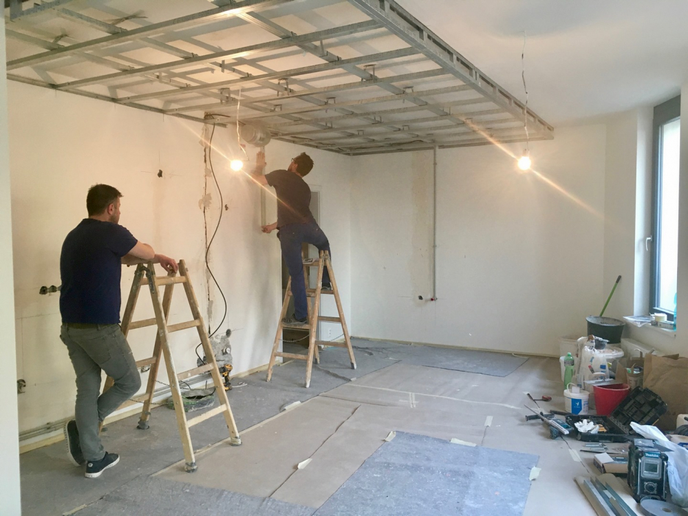 V první fázi designérka vyměnila vypínače, kliky, baterie a do obytného prostoru navrhla podhled s kovovou industriální konstrukcí k ukrytí elektroinstalace potřebné k nasvícení všech zón obytného prostoru včetně tzv. hluchých míst, která jsou úskalím netradičních tvarů místností, v tomto případě lichoběžníku.