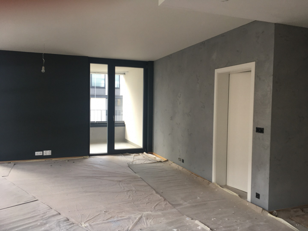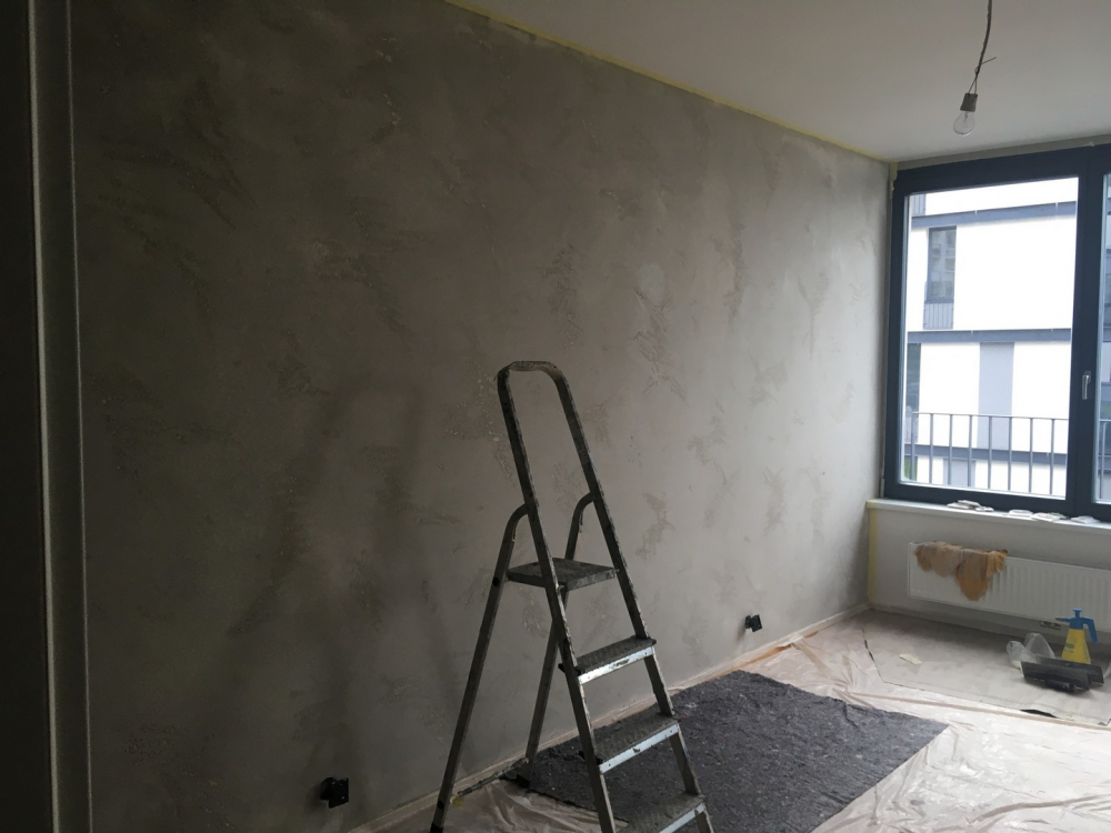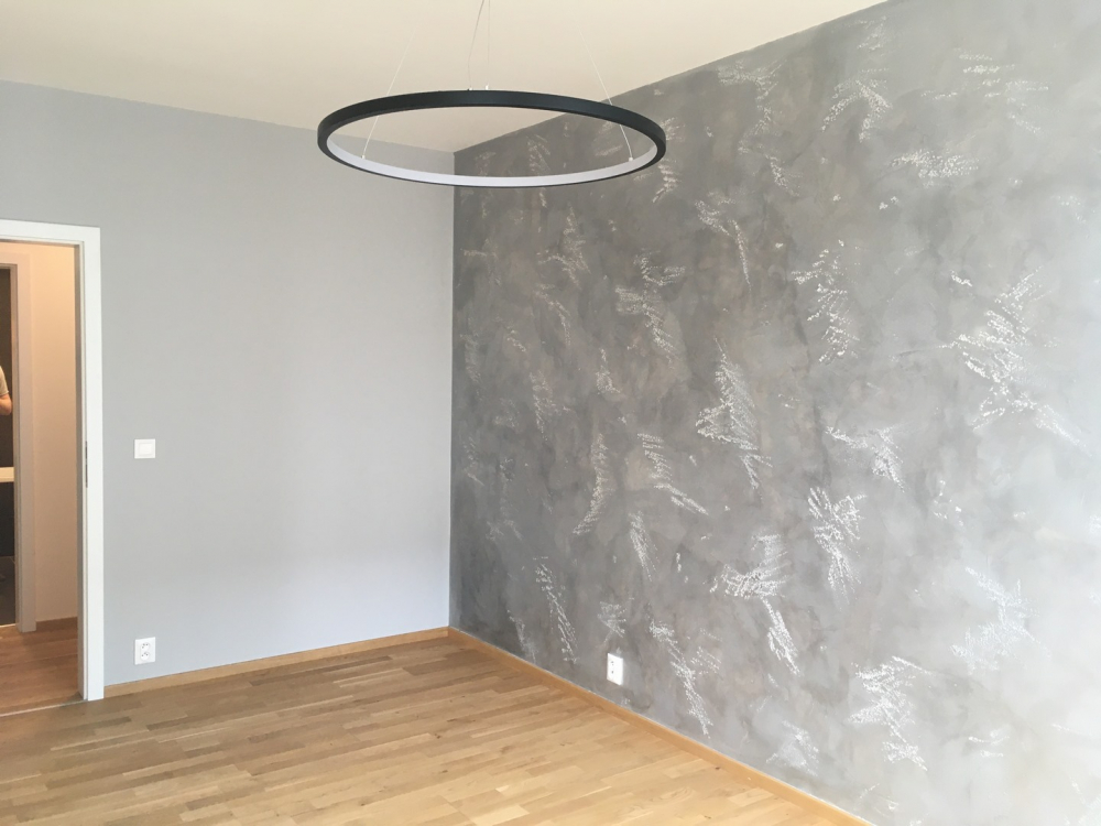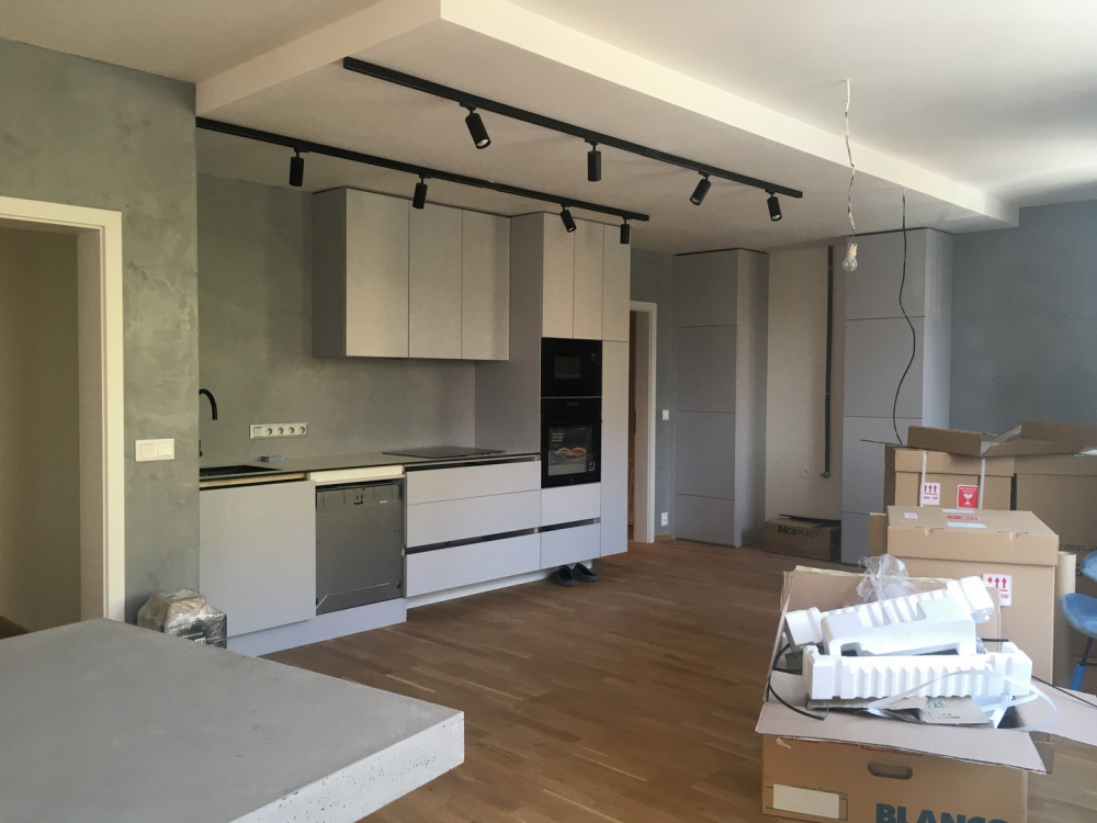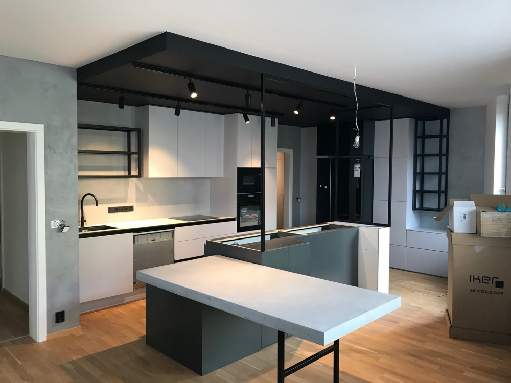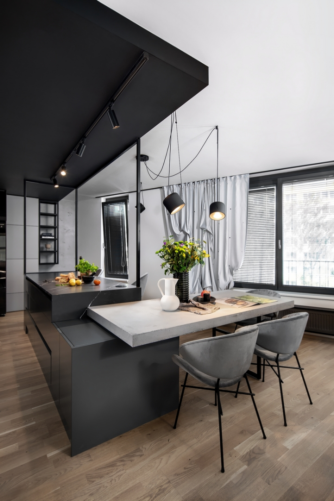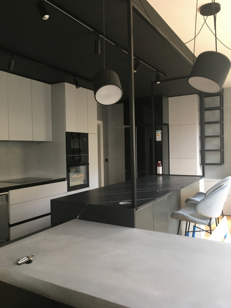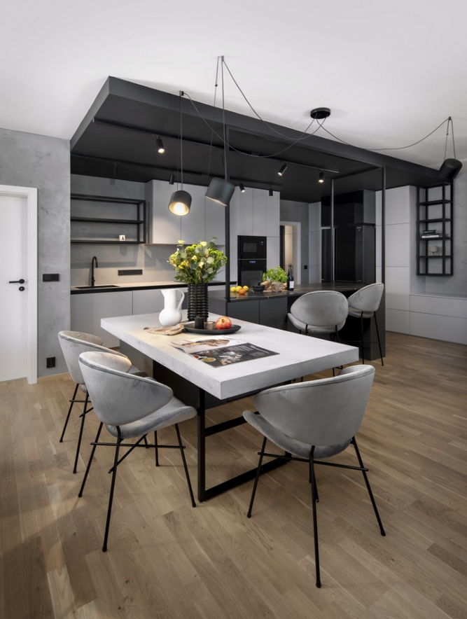 Stůl je vyrobený z duté kovové konstrukce s betonovou stěrkou opatřenou lakem. Kromě betonové stěrky designérka pracovala s dalším ušlechtilým materiálem v podobě lakovaného kovu, autorskými tapetami a šedými odstíny v rámci celého bytu. Záměrem bylo nechat vyniknout krásu dřevěné podlahy a byt „uzavřít“ do příjemné intimity.