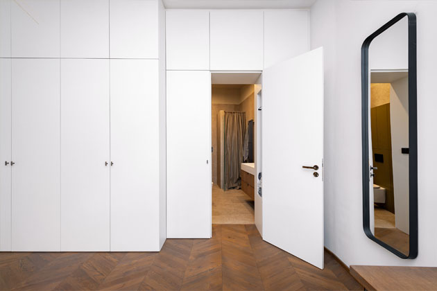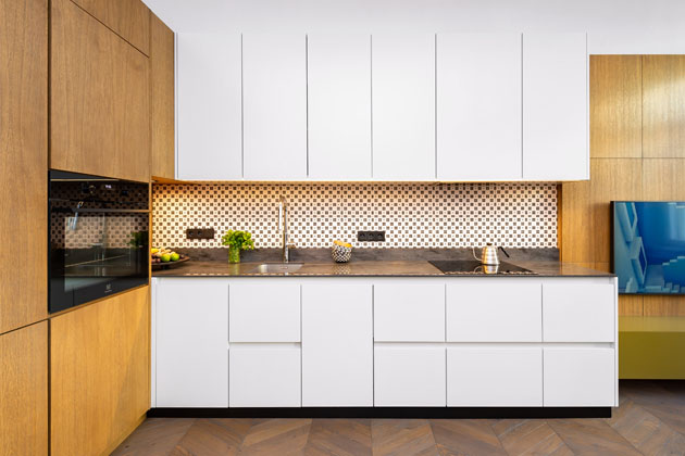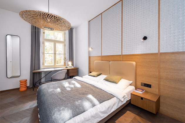 Řada lidí přistupuje k vlastnímu bydlení s utkvělou představou, že vzory a barvy se časem okoukají, a byty pak působí jako přes kopírák: bílá, šedá, béžová a trošku dřeva. Což mi přijde škoda. Když jde člověk na výstavu, do divadla nebo míjí hezké domy, také nehledá pouze neutrální tóny. Důmyslně propracované obrazy nebo scénografie se také časem neokoukají, stejně jako promyšlený interiér plný barev a textur. Proto do každé místnosti či kusu nábytku přidávám nějakou rafinovanost. Třeba skříňky pod umyvadlem nebo noční stolky nejsou jen z hladké dýhy, ale mají profrézované proužky, aby vznikla textura, která přidává věcem, a tím i celému interiéru určitou hloubku.