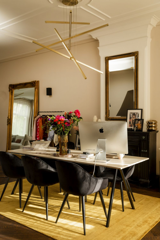 V dnešní době si samozřejmě můžete udělat svůj pracovní koutek kdekoliv, ale mě baví mít doma skutečnou kancelář. Tam jen obětavě pracuji, a musím říct, že mě to velmi motivuje a připomíná mi to, pro co to všechno dělám. Pracovní zázemí nemám moc barevné, ale miluji odstíny béžové, sáhla jsem i po trochu růžové a zábavné je pro mě hrát si s materiály. Co se týká vybavení, tak materiál pohovky je velmi odlišný od židlí. A všechno je trochu nadýchané, výjimkou je průhledný stůl. Nejoblíbenějším předmětem je polštář s leopardím vzorem a nejvíc jsem hrdá na svůj obraz s mojí milou malou dcerou Zarou-Lizzy.