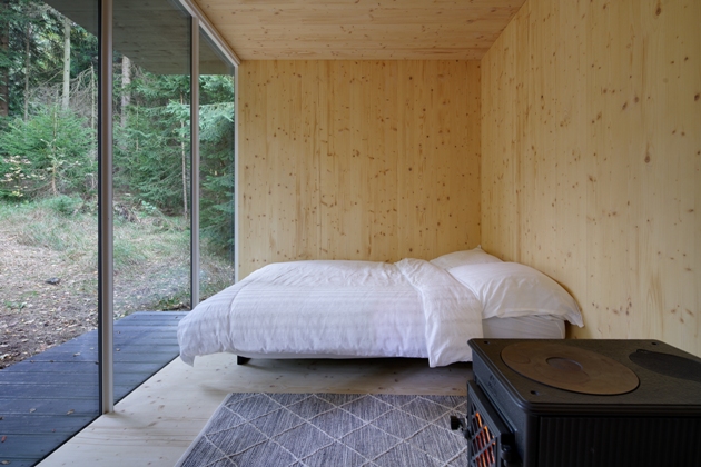 V hlavní prosklené části, která nabízí výhled do okolní krajiny, se nachází obytný prostor s postelí, kuchyní z deskového materiálu DTD s povrchovou jasanovou dýhou a kamny. Součástí rámu zasklení je skrytá garnýž, která umožňuje kdykoliv v interiéru chatky vytvořit soukromí. Plná stěna pak skrývá toaletní kapsli se záchodem i sprchou a dále technickou místnost přístupnou samostatným vstupem zvenčí.