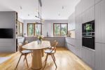 Zásadní proměnou prošla kuchyň, která se rekonstrukcí otevřela. Nově skříňky lemují obvodové stěny, zmizel ostrůvek a jídelní stůl zaujal místo uprostřed kuchyně. Ideální volbou byl oválný stůl z nové kolekce P.O.V. od firmy TON. Stůl se spolu s židlemi Again stal dominantou kuchyňské části obytného prostoru a je na něj pěkný pohled i z obývacího pokoje.