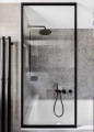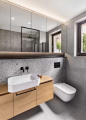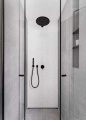 Vznikla tak dlouhá chodba, ale díky zvolenému nábytku tak opticky nepůsobí. V chodbě je za dveřmi skříněk schovaný i rozvaděč. Hned u vchodu se nachází koupelna s pracovnou. Obě místnosti bylo z praktických důvodů potřeba dispozičně pozměnit. Koupelna byla zvláštně tvarovaná a před ní byla ještě chodbička s dveřmi do pracovny. Nově se do pracovny vchází z chodby, což jí funkčně neuškodilo. Příčka se v chodbě protáhla, čímž se zvětšila koupelna, toaleta se přesunula doprava, vzniklo větší místo na umyvadlo a také nika pro pračku se sušičkou. Sprcha zůstala na stejném místě. V obou koupelnách se pokračovalo v dekoru šedé barvy s černým kontrastem.