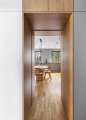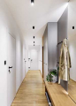 Také chodba dostala nový moderní a funkční kabát. Zrušením příček se celá více otevřela a vznikla tady dlouhá šatní stěna, jejíž součástí je průchod do obytného prostoru, kde studio nahradilo klasické dveře posuvnými, které v případě potřeby zmizí ve skříni. Protože je chodba dlouhá, studio pracovalo s nábytkem tak, že skříně barevně oddělilo a v přední části u vstupu vytvořilo dlouhou lavici se zrcadlem a větší věšákovou stěnou.