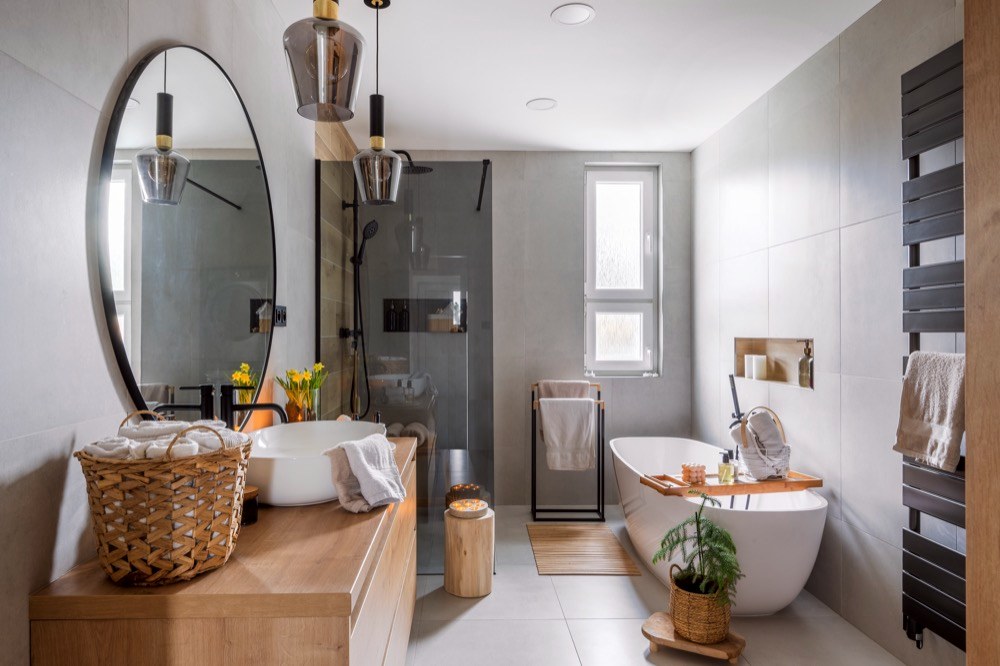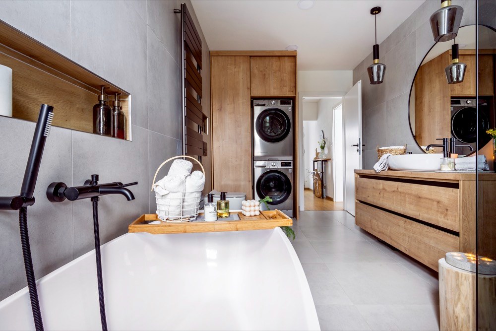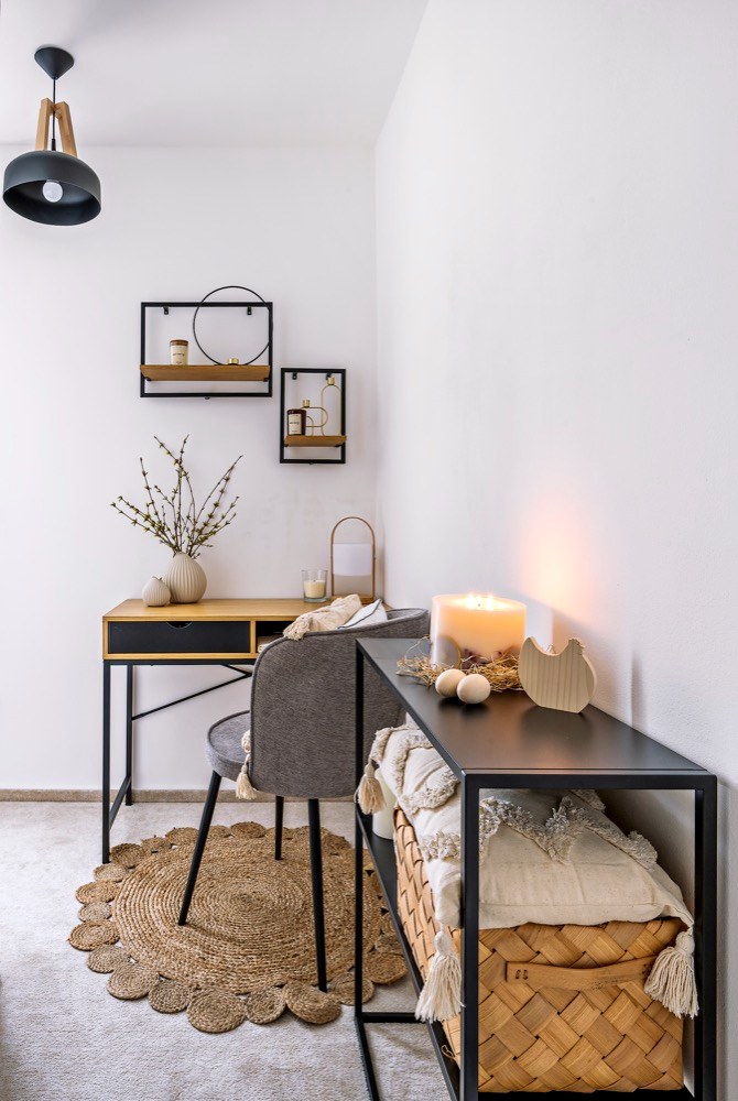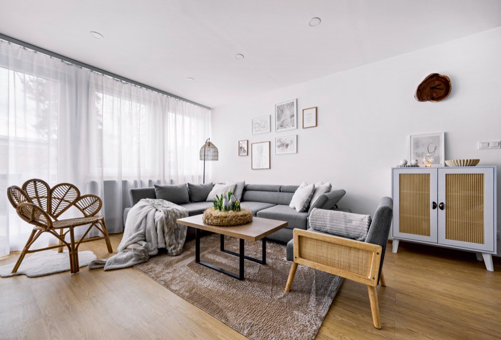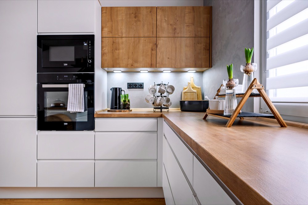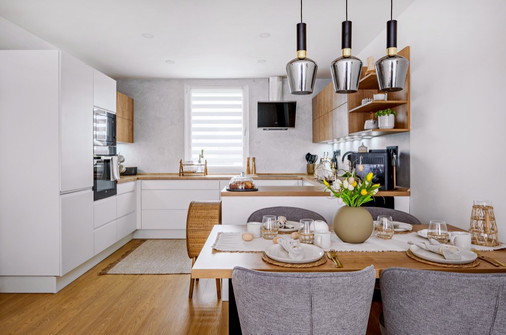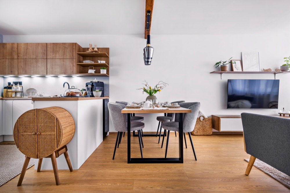 Při hledání stylu vsadila Michaela na světlé barvy, které vnášejí do interiéru svěžest, a dále na dřevo, jež mu dodává pocit tepla a útulna. Do hlavní obytné místnosti si sama navrhla kuchyň a TV stolek, které zhotovil truhlář. Jako kombinaci zvolila lamino v dekoru dub Hamilton s alpskou bílou v matném provedení. Aby zachovala jednotný dekor dřeva, jaký je na kuchyni a její pracovní desce, nechala si od truhláře uříznout desky na jídelní a konferenční stůl. Ke stolům ještě sehnali s Jakubem černé kovové podnože a sešroubovali je s deskami. Černý kov pak ladí s kovovým schodištěm, které nahradilo původní dřevěné.