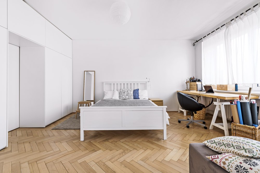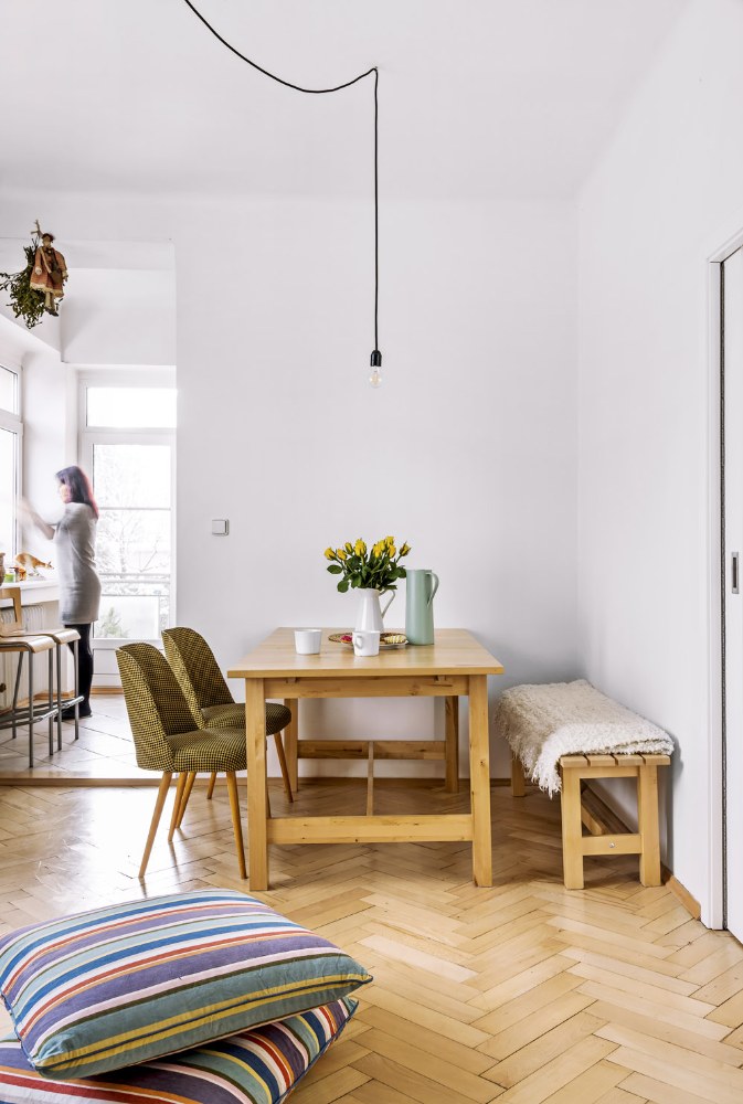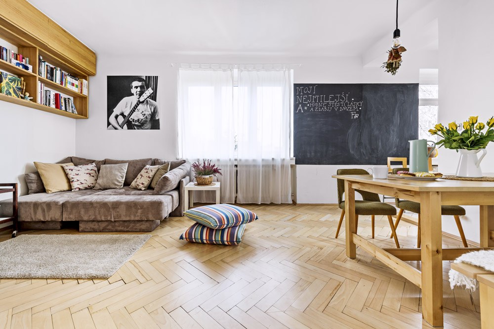 Do ložnice navrhla sestavu bílých vestavěných skříní, do níž jsou integrované i vstupní dveře. Vymyslela a namalovala i novou tvář koupelny. Vestavěný nábytek (knihovnu a skříně v ložnici) pak vyrobil na zakázku truhlář Karel Dragoun, s nímž už měla rodina dobré zkušenosti. Zbylé zařízení je převážně z IKEA, je mladistvé a příliš nestojí. K bílým vestavěným skříním pěkně ladí bílá postel. K dřevěné podlaze v obýváku se zase hodí masivní dřevěný stůl a lavice. Modulární sedačku si Anička našla na internetu u firmy Feydom.
