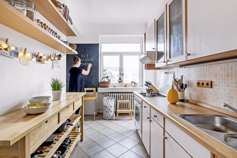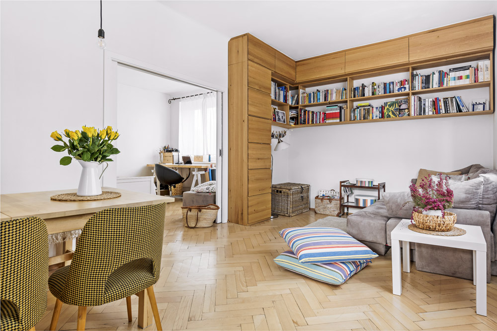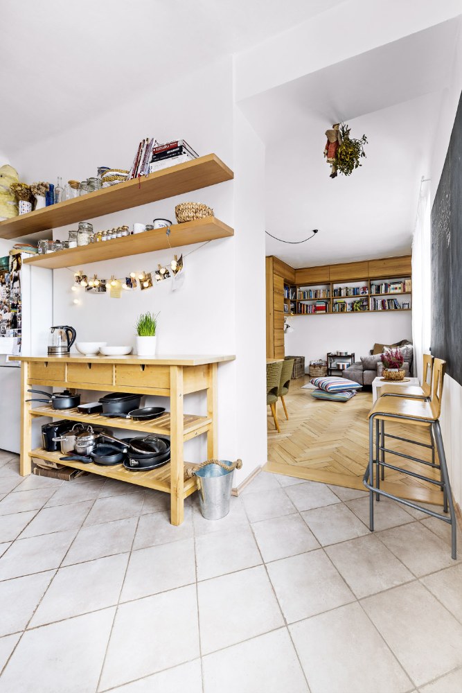 Anička měla několik představ, s nimiž se obrátila na bytovou architektku Sandru Poláčkovou. Ta si nejprve vyhledala a prostudovala půdorysy bytu, aby věděla, jak dalece se může v bytě bourat. Aniččiny představy pak ještě dopilovala a dala jim reálnou podobu. Nástěnnou knihovnu v obýváku doplnila svislým dílem s vysouvacími kontejnery a výklopnými dvířky.