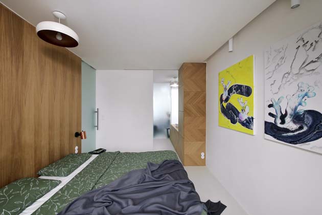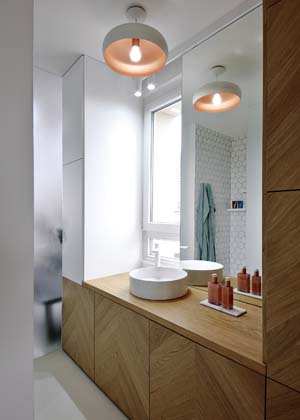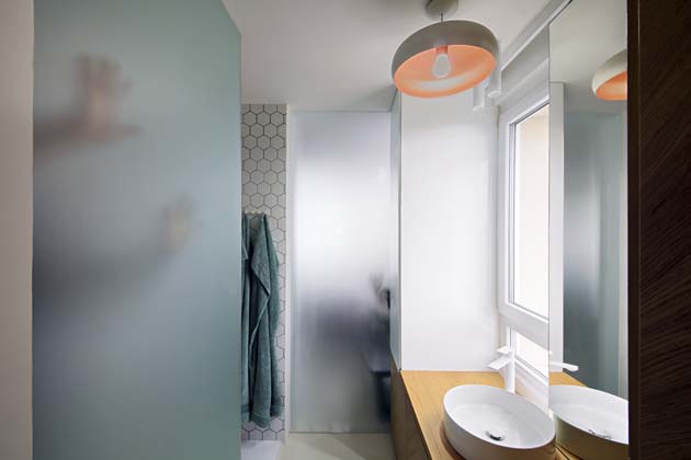 V: Jedná se o rohový byt v paneláku, takže oproti běžným bytům máme navíc jedno okno také na boční stěně – v koupelně přímo nad umyvadlem. I díky němu se do bytu dostává dost světla, které chtěl majitel s architektem využít, a tak se rozhodli instalovat celou řadu skleněných prvků. Denní světlo tak proniká skutečně úplně všude.