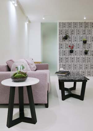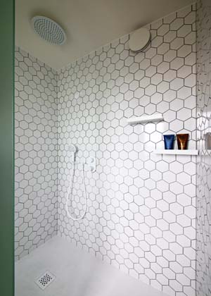 V: Měli jsme docela volnou ruku ve všem, v čem jsme chtěli. Ale nám asi hned ten původní design poměrně sednul. Je takový čistý a jednoduchý, takže jsme ladili pak třeba jen obklady – zamilovali jsme si hexagon a nechali jej prostoupit celým bytem. Dost unikátní mi přijde ta naše bylinková nebo květinová stěna, jejíž základ tvoří tvárnice.