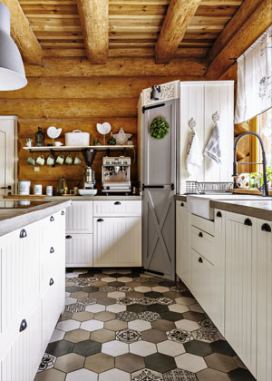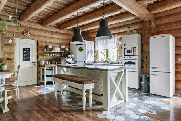 To ano. Třeba jako základ pro kuchyň posloužil výprodejový model z IKEA, ale pak už to šlo tvůrčí cestou. Obložení ostrůvku a opěrné kříže jsem vyráběla sama. Betonovou pracovní desku kuchyně i ostrůvku jsme vyráběli s přítelem. Lavice u ostrůvku je z bývalého stolu, který nesl soused spálit na oheň. Tak jsem ho zachránila, použila nohy, vyrobila sedací desku i s čalouněním. Asi dva měsíce jsem se potýkala s výrobou „kamenné“ stěny mezi koupelnou a obývákem. Na zeď jsem si postupně natahovala lepidlo a do něj obtiskávala silikonová razítka. Pak jsem tu stěnu melírovala černou a bílou barvou, aby to vypadalo jako kamenný obklad. Další stěnu u schodů jsem obkládala starými prkny. Taky jsem tu chtěla mít krb, a protože skutečný funkční by vyšel na hodně peněz, tak jsem si vyrobila aspoň krb umělý, aby tam na Vánoce mohly viset ty ponožky. Lustry jsou ze zavařovacích sklenic.