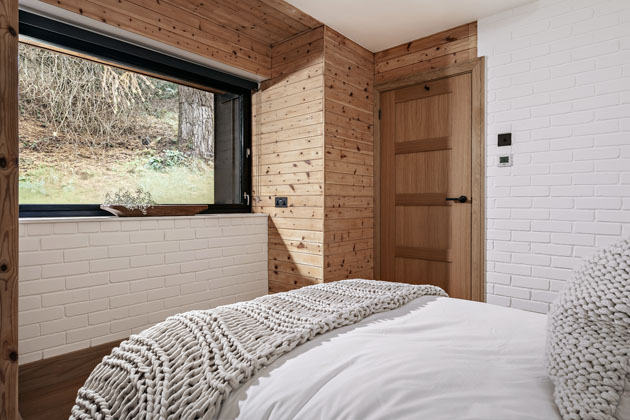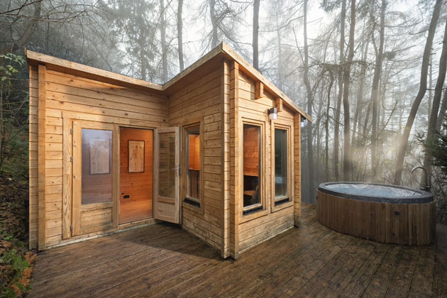Dům s kubistickou siluetou je usazený ve svahu, obložený zinkovým plechem a modřínovým dřevem a obklopený kaskádou venkovních teras. Velké prosklené plochy vpouštějí dovnitř dostatek světla a nechávají ho ve světlém interiéru nabýt na síle, o soukromí se postará okolní hustý porost. Dům není ohraničený žádnou zahradou, neboť tu plně zastupuje okolní les.