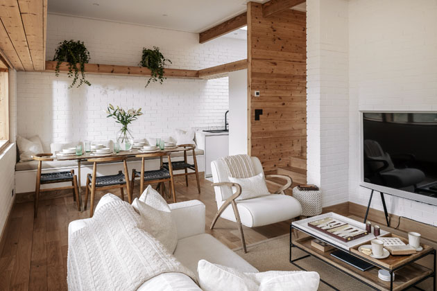 Vybavení interiéru vychází se skandinávského stylu, hojně využívá přírodní materiály, světlé barvy s různými povrchovými strukturami a jednoduché autentické doplňky. Ačkoliv je skandinávský styl známý svou skromností, na pohodlí obyvatel se tu hodně myslelo. Měkoučkými polštářky, krbem a velkoplošnou televizí počínaje a saunou, posilovnou či venkovní vířivkou konče: veškeré vybavení je podřízeno maximálnímu komfortu. I když se technicky jedná o jednopodlažní byt, do hlavního obývacího pokoje a do dvou dvoulůžkových pokojů vede několik krátkých schodišť. Toto uspořádání je způsobeno umístěním budovy ve svahu a ozvláštňuje prostor o další nekonvenční prvek.
