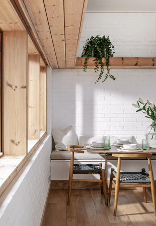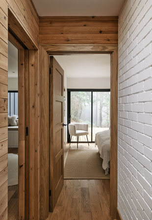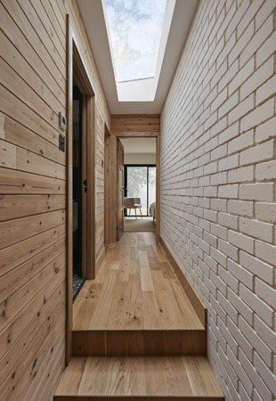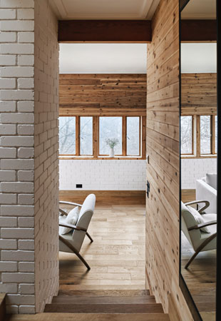 Interiér navazuje na venkovní vzhled budovy a hojně využívá modřínové dřevo také uvnitř. Nekombinuje je ovšem s antracitově černým kovem, nýbrž s mnoha bílými plochami. Díky nim je opticky větší, útulný a otevřený.