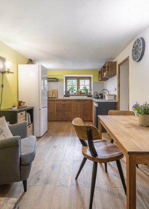 Nejprve bylo potřeba promyslet dispozici. Nějakou představu Katka s Mílou měli, ale raději si k tomu přizvali známého, který je stavebním inženýrem. Hlavní vchod a chodbu nově situovali do prostoru bývalé sauny, která se už nepoužívala. Tady bylo ale nutné jít pod úroveň podlahy, protože vchodové dveře byly příliš nízké. Z bývalé Renatiny ložnice měla vzniknout kuchyň s jídelnou, protože už sem byly z dřívějška přivedené rozvody vody a plynu.