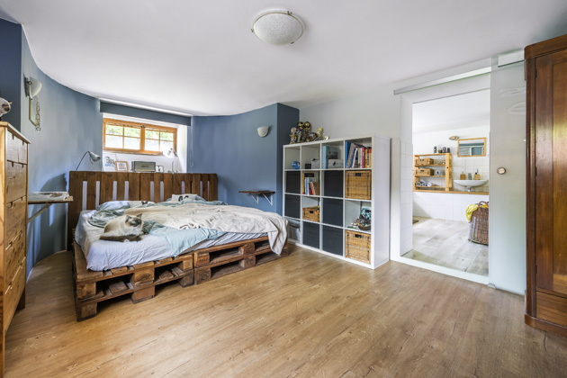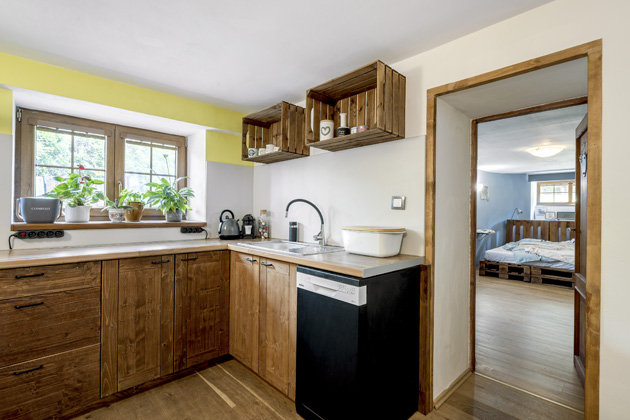 Foto: Lukáš HausenblasMíla pokácel túje, čímž se otevřel výhled do zahrady a mohla vzniknout menší skalka a bylinková zahrádka. Jak říká Katka: „Byl to docela punk, ale přežili jsme to!“ V současné době se rodinka rozrostla o malého Sebastiána, takže paletový nábytek se přestěhoval na zahradu a v hlavní obytné místnosti trůní vysoká postel 2 × 2 metry s úložným prostorem, místo pracovních stolů je dětská postýlka s přebalovací komodou a paletový gauč nahradil pohodlný ušák. Až začne Sebastián běhat, tak asi proběhnou další „škatulata...“