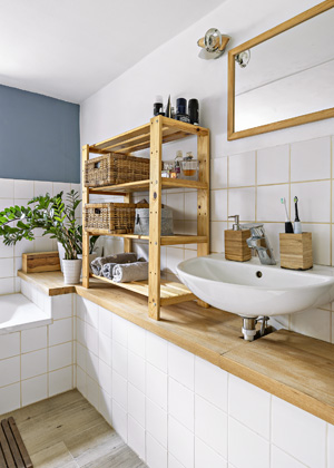 Foto: Lukáš HausenblasTen si tehdy budoval truhlářskou živnost a jejich kuchyň byla jeho první zakázkou. Horní skříňky ke kuchyni tvoří dřevěné bedýnky z Hornbachu. U firmy Démos pořídili pracovní desku a obkladové desky na zeď za kuchyní. Kusem nábytku, kterému by Katka udělila cenu za funkci a za design, je regál Kallax z IKEA, který se vyrábí v mnoha rozměrech, několika barvách a do regálů se dají vkládat úložné koše i krabice. Katka ráda podporuje i tuzemské firmy, tedy když přišla na řadu koupelna, vybrali s Mílou obklady a dlažbu od české značky RAKO.