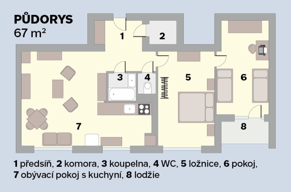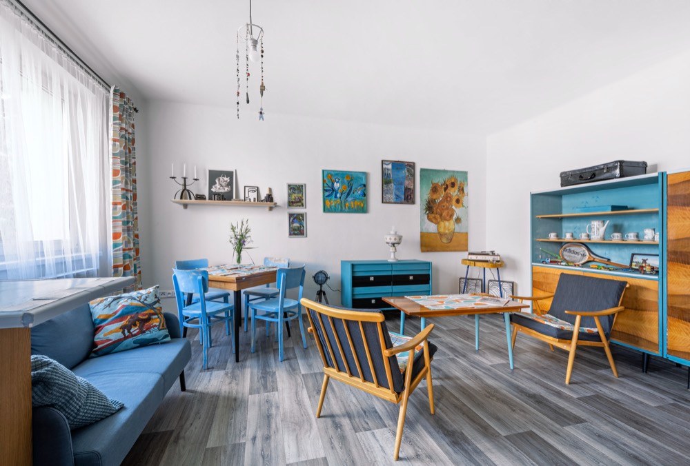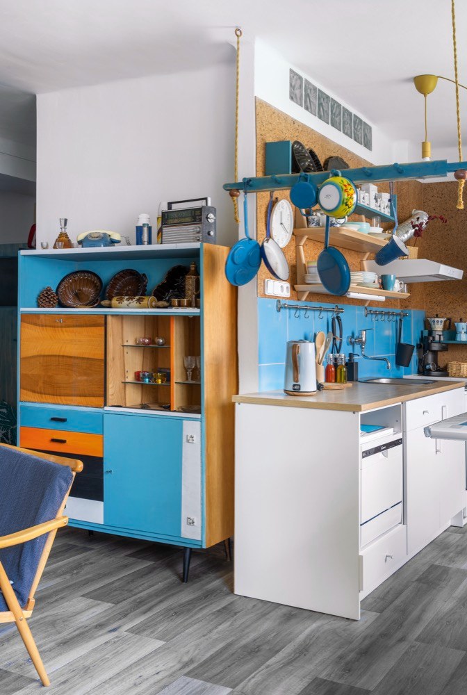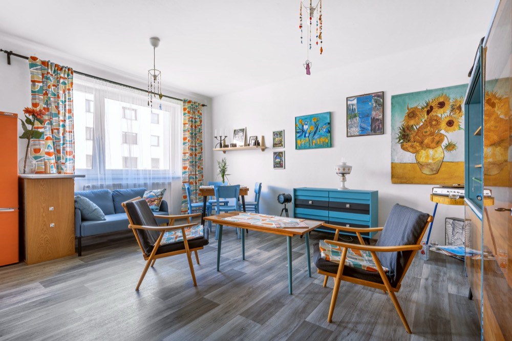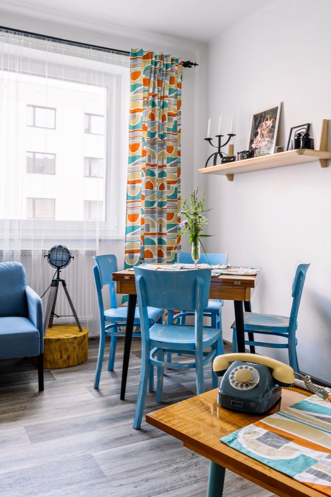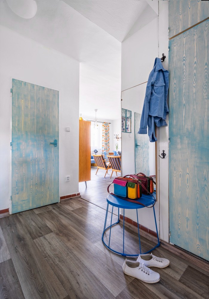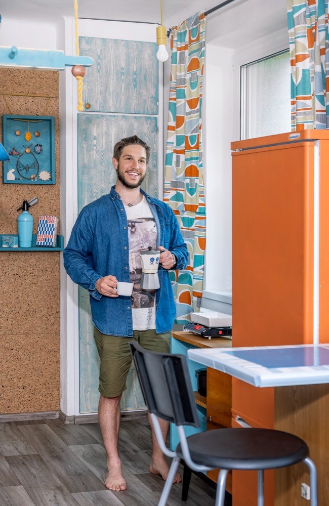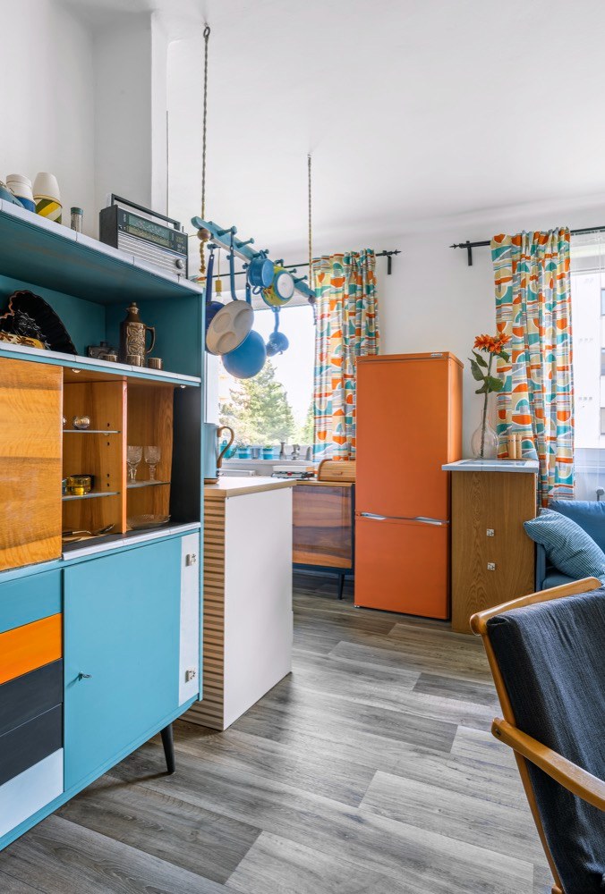 Byt na sídlišti dostal Martin od svého táty, který ho zdědil po mamince. Po jejím odchodu se byt šest let nevy-užíval. Když došlo na rozhodnutí o rekonstrukci, měl Martin jasno v tom, že půjde o razantní zásah. A protože je lomnický patriot, snažil se využít na odborné práce místních řemeslníků, na drobnější výpomoc si přizval i kamarády. Aby interiér více odpovídal současným nárokům na bydlení, částečně se měnila původní dispozice 3 + 1 na 3 + kk. Zrušením stěny mezi kuchyní a obývacím pokojem pak vznikl mnohem vzdušnější prostor s tím, že kuchyň je teď součástí obýváku. Do stavebních prací bylo nutné zahrnout i výměnu původních oken za nová plastová. Rekonstrukce obnášela také nové rozvody elektřiny, vody a odpadů. Po likvidaci starého linolea na podlahách se ještě ukázalo, že před položeným nové krytiny je potřeba srovnat podlahy nivelační stěrkou. Jako novou podlahu zvolil Martin zátěžové linoleum Puretex dodané místní firmou Boch. Vyšší částku z rozpočtu „ukousl“ nový plynový kotel a radiátory. Kuchyň z IKEA, spotřebiče do kuchyně a koupelna už se nesly v duchu minimální režie. Téměř veškerý nábytek, který v bytě po babičce zůstal, byl ve velmi dobrém stavu a Martinovi i Janě bylo líto ho zlikvidovat. Takže zatímco v bytě se bouralo, na zahradě u Jany se brousilo, lakovalo a patinovalo. Když bylo po stavební stránce hotovo, začal se postupně rodit vlastní interiér. Díky zrenovovaným kouskům nábytku a Martinově zálibě v retru bylo rozhodnuto, kudy se styl bude ubírat. Ač Martin dobu šedesátých a sedmdesátých let nezažil, tehdejší design se mu moc líbí. Začal tedy intenzivně shánět doplňky z té doby, aby mu byt dozdobily. Něco objevil na burzách, na e-shopech a pár kousků dodali i kamarádi. K fotografování nám Martin uvařil kávu v moka konvičce s cibulákovým vzorem a atmosféru zpříjemnil pouštěním vinylových desek na původním gramofonu.