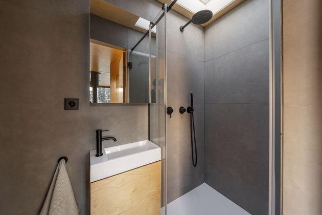 Koupelna je od zbytku interiéru oddělená dveřmi z překližky, které architekt vybavil systémem Magnetic od českého výrobce M&T. Vybral ho proto, aby byl uvnitř zachován princip maximální jednoduchosti. K ovládání postačuje minimalistické madlo a celý systém Magnetic funguje ryze na principu magnetické síly. V tom spočívá jeho dokonalá jednoduchost. Do dveřního křídla jsou zabudované magnety a do zárubně jejich protikus. Když se k sobě obě části přiblíží, dveře se plynule dovřou a drží v zárubni, aniž by se vysunula střelka, která by je mechanicky zajistila. K otevření dveří tak stačí jednoduše zatáhnout za madlo. Pro ovládání dveří autoři zvolili subtilní madlo YES! ve verzi s WC/koupelnovým uzamykáním integrovaným přímo do jeho konstrukce. Díky černému titanovému povrchu madlo kontrastuje se světlým dekorem překližky. Kování současně odpovídá jedné z hlavních myšlenek celé stavby – udržitelnosti.