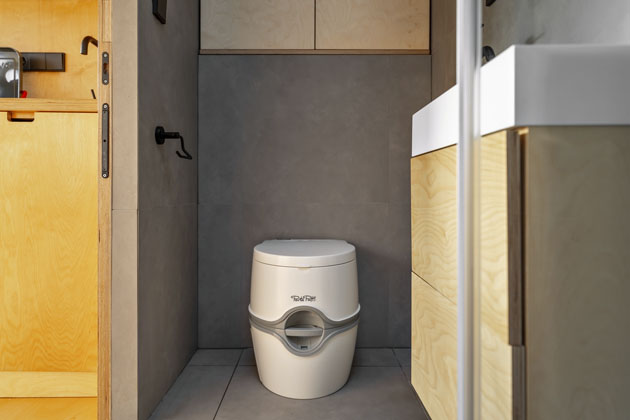 Celý interiér se nese ve znamení multiplex březové překližky, která svým světlým odstínem a klidnou texturou dřevodekoru působivě kontrastuje s vnějším tmavým obkladem. Překližka byla zvolena proto, že přírodní dýha ve světlém odstínu opticky zvětšuje celý prostor. Zároveň má skvělé vlastnosti, co se týká pevnosti a odolnosti. Její působivá jednoduchost navíc vyvolává velmi přirozený dojem. Součástí interiéru je kuchyňský kout s lednicí i dvěma plotýnkami na plyn a také samostatná koupelna s teplou sprchou a chemickou separační toaletou. I koupelna má dostatek přirozeného denního světla díky střešnímu světlíku.