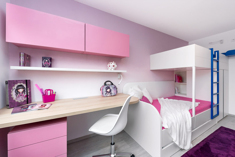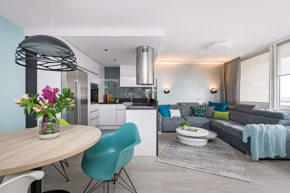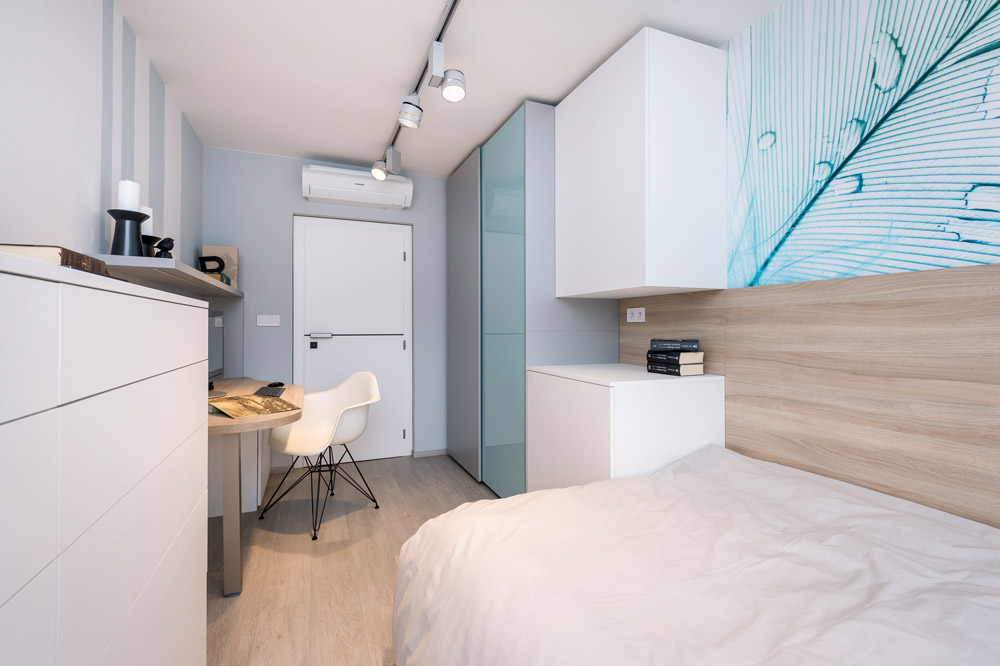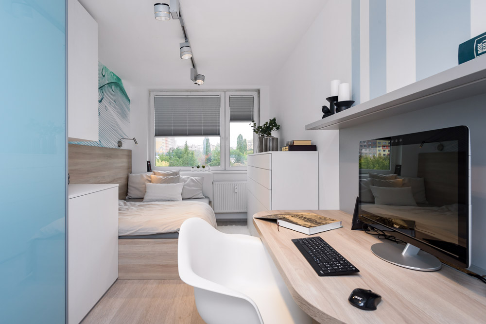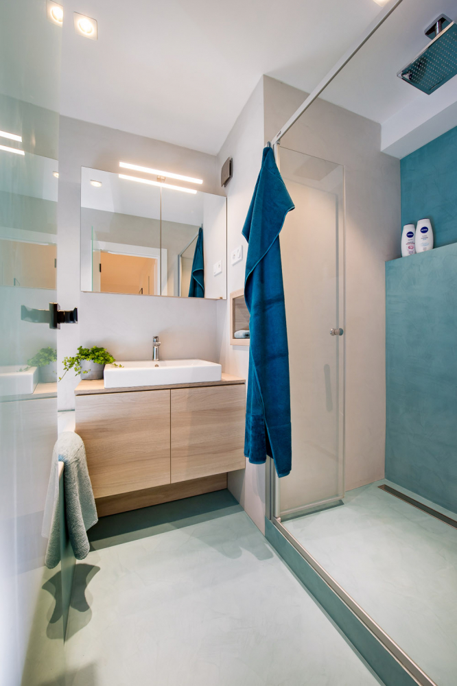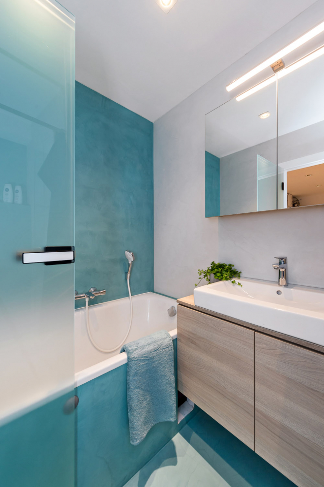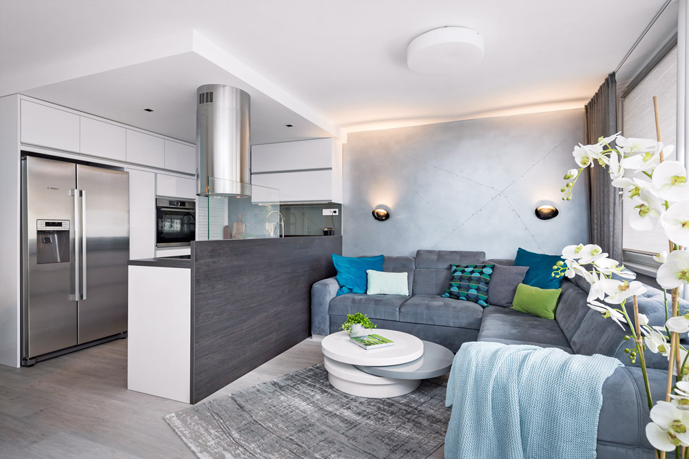To všechno jsem dodržela a původní minimalistické zadání ještě trošku odlehčila. Všude, kde to šlo, jsem umístila úložné prostory – v ložnici je vestavěná skříň, pod postelí úložný prostor, v pokojíku jsou součástí palandy skříně a úložné police, pod postelí je výsuvné lůžko atd… Zajímavým prvkem jsou v interiéru stěrky. V koupelně na stěnách je stěrka laděná do modra, v obývacím pokoji je za sedačkou hliníková stěrka s efektem plechu.
