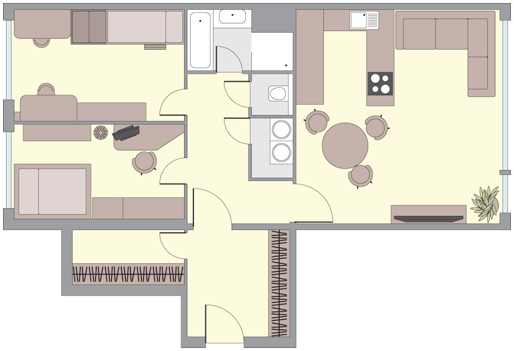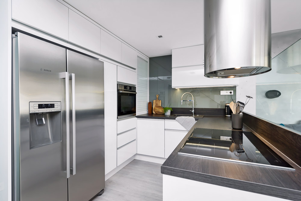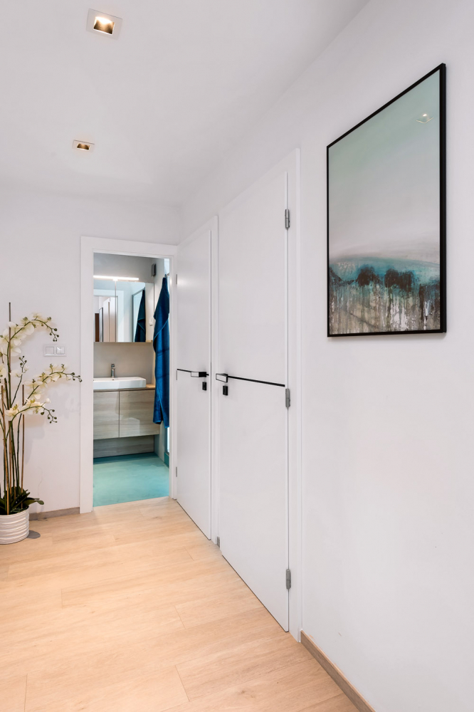Původní dispozici 3 + 1 jsme vybouráním příčky mezi kuchyní a obývacím pokojem změnili na 3 + kk, aby mohla vzniknout velká místnost společná pro kuchyň, jídelnu a obývák. Částečně se také měnila dispozice koupelny a chodby, kde se zmenšoval prostor, aby se vešla komora pro umístění pračky se sušičkou. V zadání majitele byl kladen důraz na jednoduchost, větší podíl skla, použití stěrky, čisté plochy beze spár, šedý základ s bílou kuchyní.