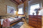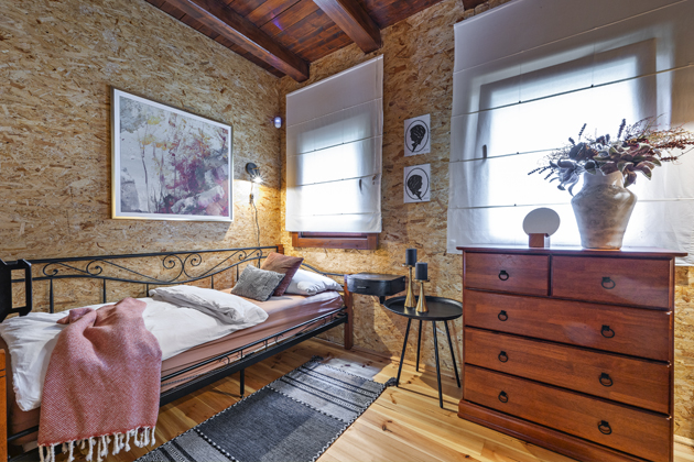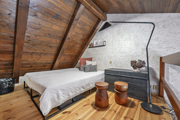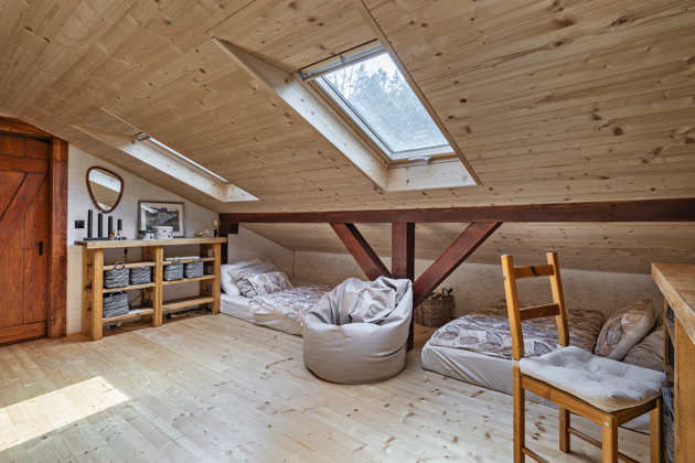 Větším rozsahem prací bylo předělání půdy na další obytné prostory. Původně se na půdu chodilo venkovním schodištěm a skladoval se tam jen zahradní nábytek. Po zateplení vznikl pokoj pro syny a ve vedlejších prostorách ještě podkrovní místo na lůžko pro hosty. Díky novému schodišti se na obytnou půdu chodí přes jeden z hostinských pokojů. Po čase se Kristina s Honzou rozhodli, že by bylo dobré osvěžit stávající dřevěné podlahy, a tak je nechali přebrousit a znovu nalakovat.