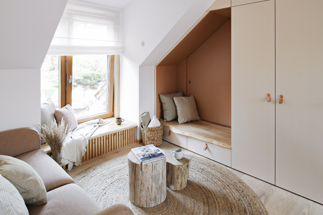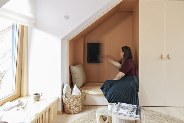 Vestavěná stěna je kompaktní od podlahy až po vrchol šikmého stropu, díky čemuž ji nevnímáte jako kus nábytku, který by v podkrovním prostoru opticky zabíral mnoho místa. Ve vrcholu stěna pomocí dřevěných latí schovává klimatizaci, samozřejmě tak, aby nebyla omezena její funkce. V hlavním pokoji se také nachází jídelní stůl s lavicí a židlemi. V druhém pokoji pak najdeme velkou manželskou postel, skříň s oblým rohem, úložný prostor v šikmině u nadezdívky a velké čtecí křeslo.