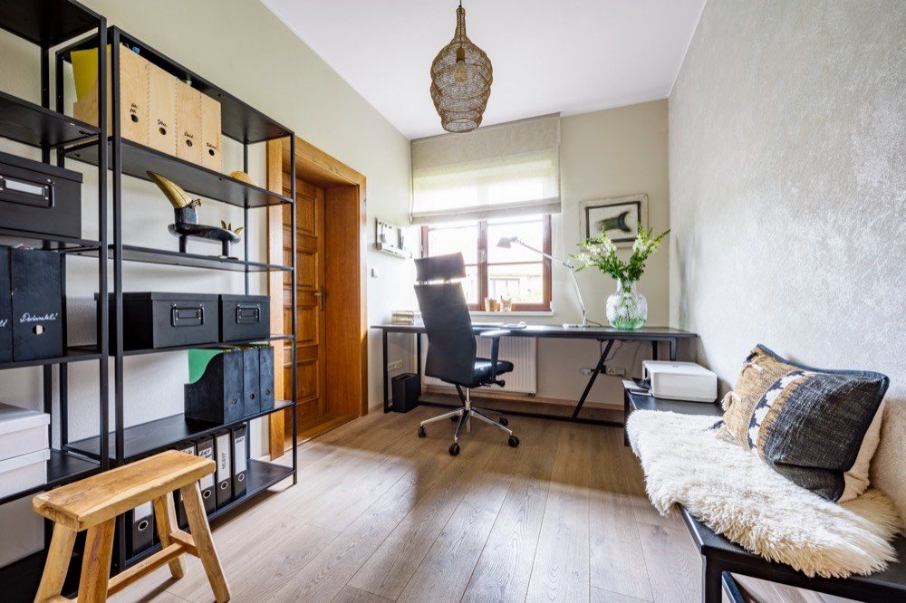 Původně jsem chtěla něco extravagantního třeba ve formě tapety, ale nakonec jsem vytvořila klidovou zónu ozvláštněnou tapetou s mandalami, kde mě při práci nebude nic rozptylovat. Jsem moc ráda za obrovský pracovní stůl na míru. Má asi dva a půl metru, ale běžně tam nevidíte centimetr volného místa, protože je zavalený katalogy a vzorníky, podobně jako lavice. Jsem vděčná, že mám klidný prostor na navrhování interiérů a vyřizování objednávek z mého