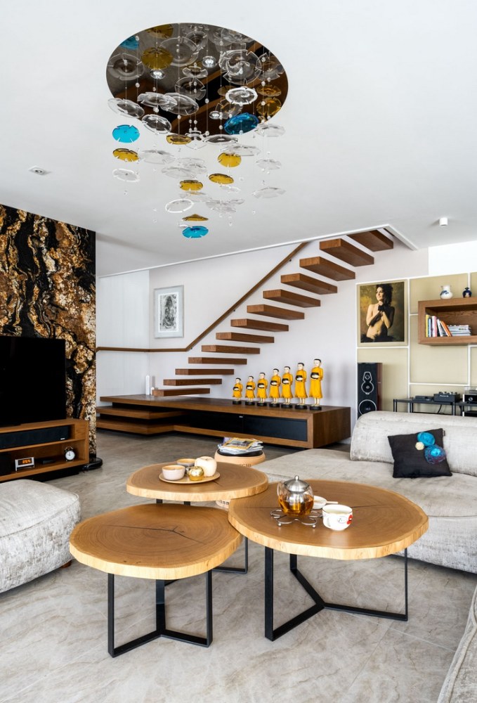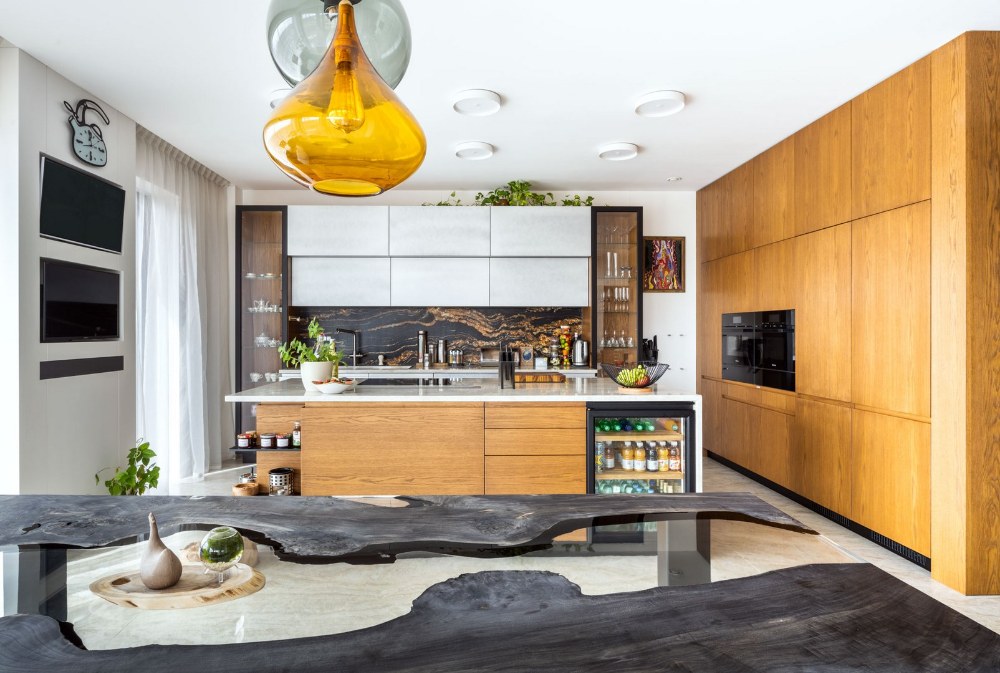 Všechno tady je velká zásluha architektky Anety Stružkové. Požadavky na ni byly navrhnout dům, který by se hodil do této lokality. Co se týká interiéru, chtěli jsme do domu dostat co nejvíc přírodních materiálů a světla. Proto tolik kamene a dřeva a prosklené velké plochy. Dále architektka vycházela z toho, že máme rádi věci, které mají své příběhy, nebo nesou životní příběhy těch, kdo je vyrobili. A když to jen trošku půjde, tak aby zařizovací předměty odrážely i nějakou tradici.