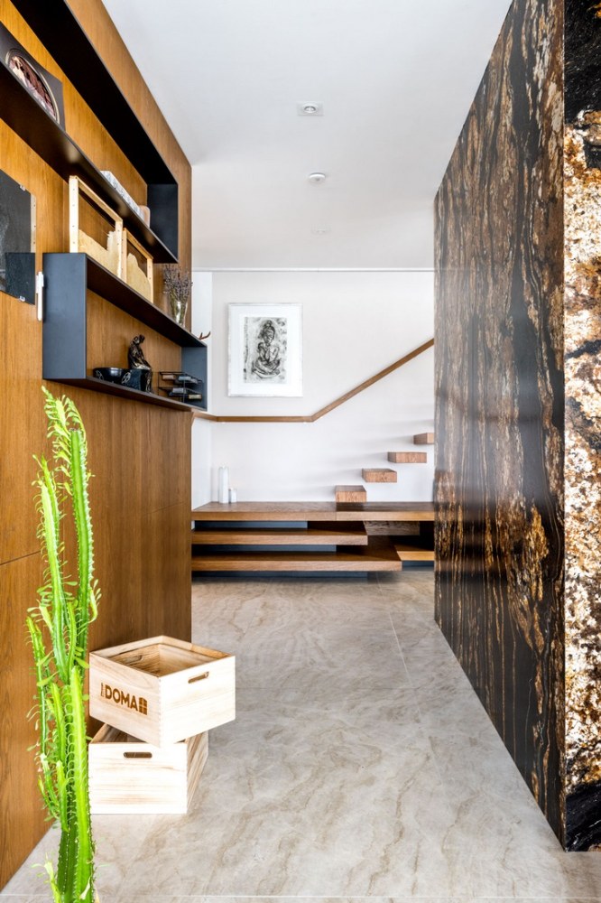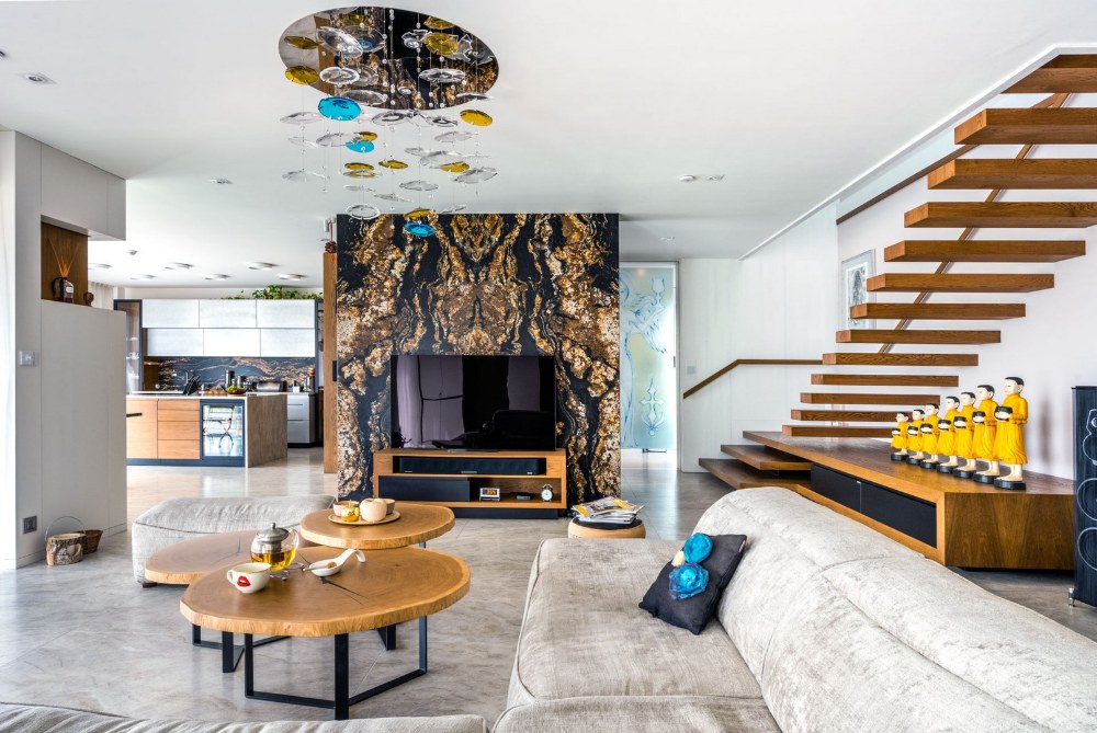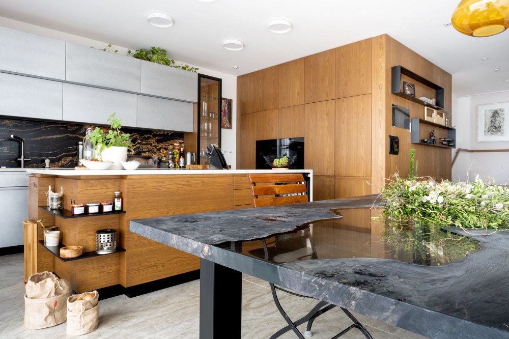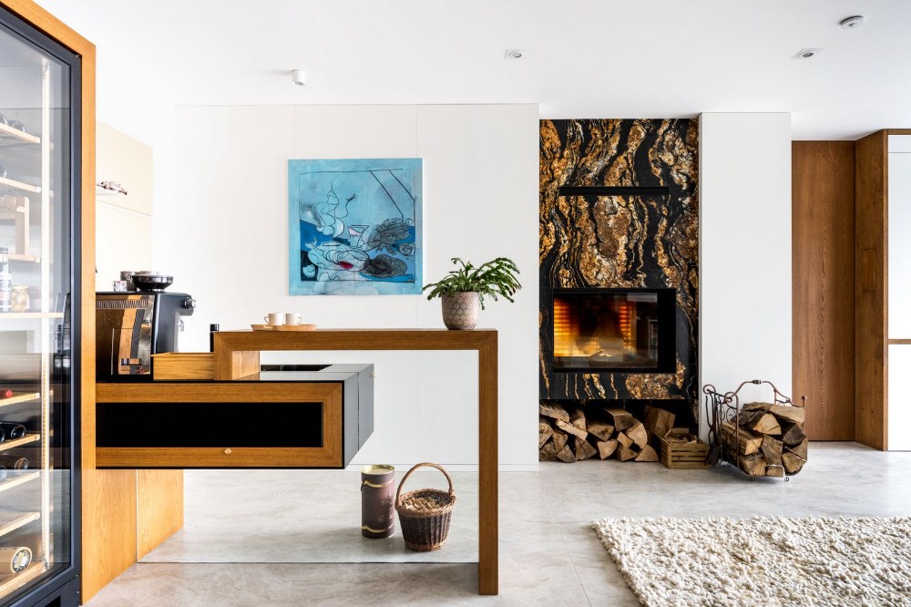 Když jsem ten kámen viděla, tak jsem vůbec nechápala, že může příroda něco tak nádherného vytvořit a okamžitě se do ní zamilovala. V kamenictví jsme pak ještě vymysleli další možnosti, jak žulu dále v domě využít. Světlá žula je použitá i na podlaze v celém přízemí. V rámci provozu domu s přímým vstupem na zahradu je to s ohledem na údržbu a životnost velmi praktické. Pocitový chlad kamene řeší podlahové vytápění. Mimochodem žula na podlaze je dovezená z Itálie a jmenuje se Tádž Mahal, což je nám sympatické, protože rádi cestujeme a milujeme orientální věci.