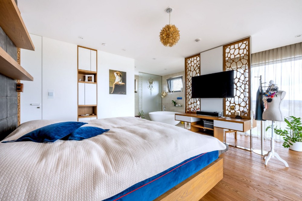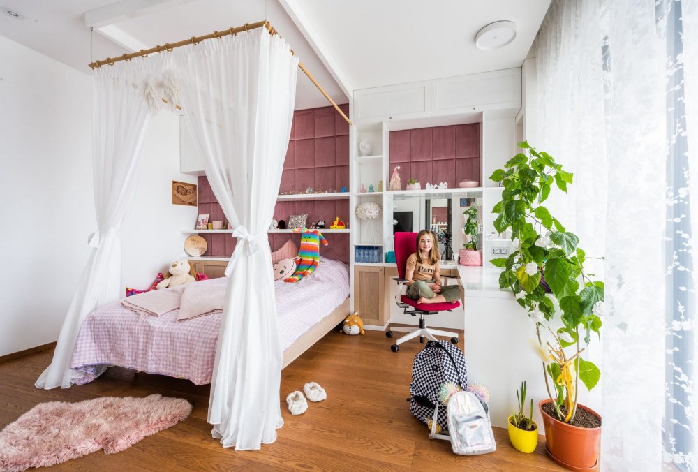Děti byly už ve věku, kdy si řekly, co by v pokojíku chtěly mít. Monča si přála třeba nebesa… Hlavně jsme ale dbali na to, aby byly pokojíčky trošku nadčasové a nemuseli jsme je za pár let předělávat. U každého pokojíčku mají děti ještě šatnu a koupelnu, což není kvůli tomu, že bychom je tak rozmazlovali, ale přišlo nám to dobré s ohledem na soukromí, které budou mít, až si třeba jednou domů přivedou partnery.