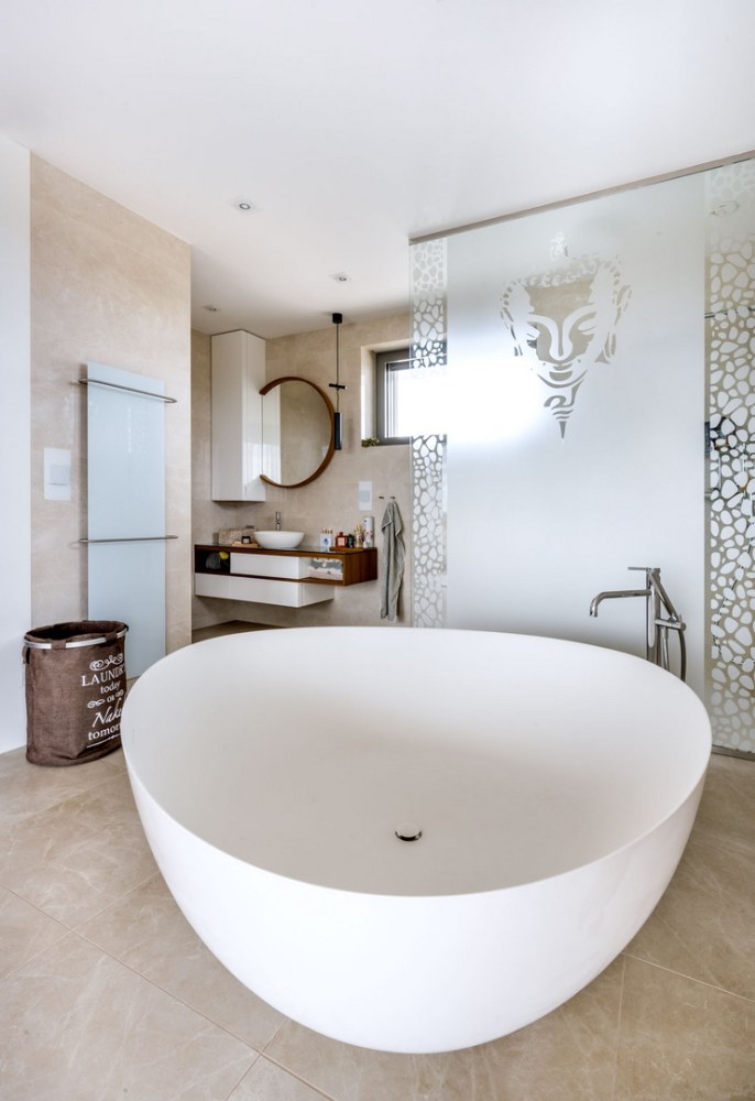Tento nápad jsme si přivezli z cest, kde jsme v nějakém hotelu měli vanu přímo v pokoji. Moc se nám to líbilo a přáli jsme si to tak mít. Sice jsme vanu museli do patra stěhovat oknem a jeřábem, ale vyplatilo se.