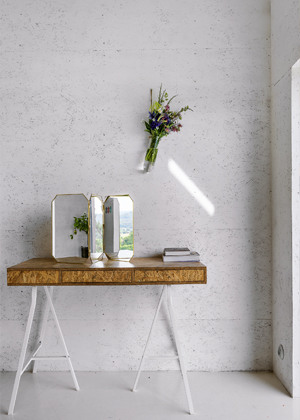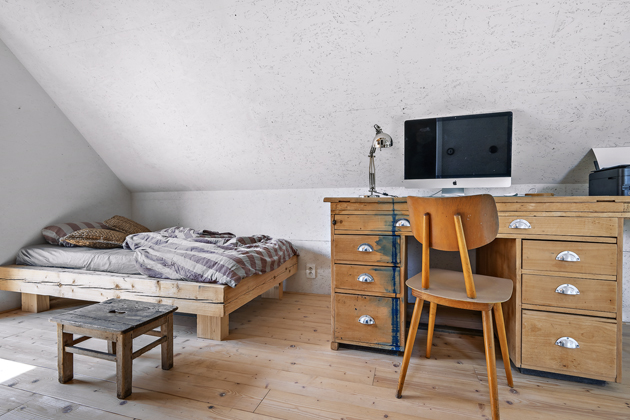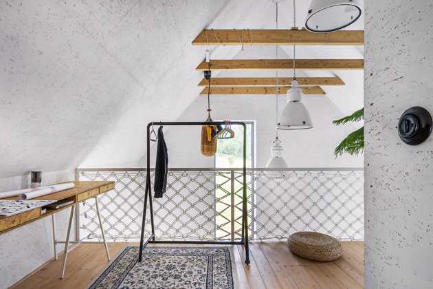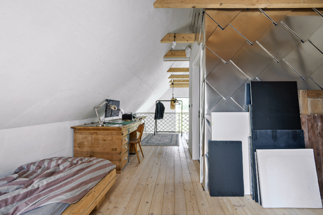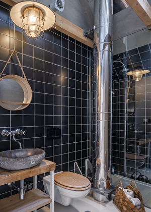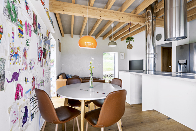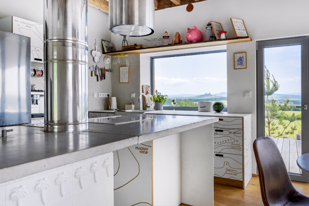 Původně jsme měli fotit jen ateliér, ale bylo by škoda neukázat vám, jak si lze zařídit interiér, když jsou majitelé vedeni srdcem a doma si to opravdu „vymazlí“. Každá drobnost tady zrcadlí jejich záliby, vzpomínky a um. Je to vlastně takový malý rodinný showroom. Přestože se Gábi s Tadeášem zrovna vrátili z cest a nebyli na focení připraveni, laskavě nás vpustili do samého srdce domu, tedy do hlavní obytné místnosti s kuchyní. Uprostřed místnosti trůní ostrůvek s kachlovými kamny na dřevo, díky kterým je dům absolutně soběstačný. V zimě ho celý vytopí, v troubě si upečete a na plotně uvaříte, usušíte tady bylinky i věci mokré od sněhu. Do moderní dřevostavby chtěli majitelé zakomponovat tradiční prvek, a tak kamna zdobí bílé kachle, ovšem s netradičním motivem palmy, jež je symbolem amerického fast foodu, který je v této rodině oblíben. Pohledové plochy kuchyně zase zdobí vrstevnice s názvy skalních věží Českého ráje. Tadeášovou zálibou je totiž lezení, a tak si ji takto přenesl i domů. Kromě těchto a jiných specialit jinak majitelé kupovali nábytek třeba i v IKEA. V přízemí je dále malá pracovna, hlavní koupelna, malá prádelna zasunutá pod schody, předsíň a mini technická místnost. V patře jsou dva dětské pokoje, malá koupelna a ložnice. Oba objekty jsou spojeny pochozí terasou.