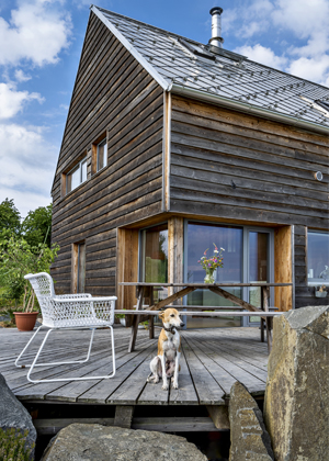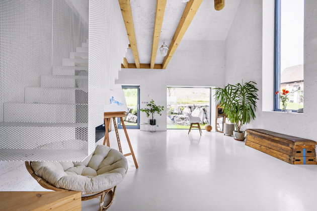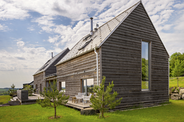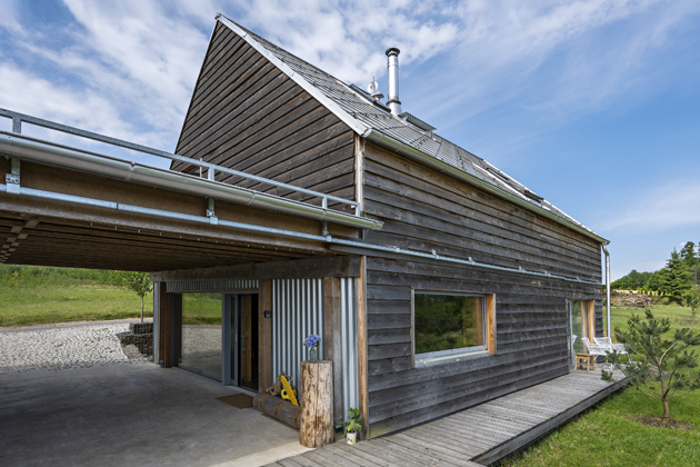 Tadeáš je profesí architekt, takže připadal v úvahu jen dům, který si sám navrhne. Gábi je zase designérka, tedy nastala ideální tvůrčí konstelace k tomu, aby vzniklo něco pěkného a neobvyklého. Pro své budoucí bydlení si zvolili dřevostavbu, která se staví způsobem two by four. Jako fasádu vybrali neošetřený sibiřský modřín, jehož povrch časem krásně patinuje. I když parcela ještě není v chráněné oblasti Český ráj, konceptem chtěli navázat na českou venkovskou architekturu. Tvarem, materiálem i některými prvky dům evokuje dvě stodoly. Svým umístěním podél vrstevnice dodržuje i krajinný ráz. Byť je to moderní stavba a vyčnívá materiálem, hliníkovou střechou a peřením, do krajiny dokonale zapadá. Už v projektu bylo počítáno s tím, že bude půlka domu určená k bydlení a půlka bude sloužit jako ateliér. Práce byla pro oba majitele prioritou, a tak vznikl nejdřív ateliér. Příchod dvou malých dětí pak urychlil práci na soukromé části stavení. Oba jsou patrioti, a tak se snažili při stavbě využívat místní řemeslníky a používat tradiční materiály.