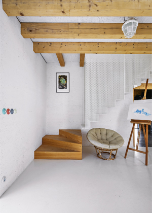 Těsné propojení práce a soukromého života je pro Gábi a Tadeáše ideálním řešením. Pro své profese žijí, a tak jsou rádi, že to mají do práce jen pár kroků přes terasu. V ateliéru mají zázemí pro sebe, ale zároveň ho i pronajímají. Díky účtu na instagramu @atelier_ceskyraj se můžete dozvědět, co všechno tam vzniká. Ateliér je rozdělený na bílou a černou část, kdy v bílé je hezké světlo ideální pro denní focení, černá část prostoru je vhodná pro focení se světelnou technikou. Protože je ateliér tvůrčí prostředí, chtěli tam použít nějaký extravagantní prvek, který by doplnil jak černou, tak i bílou část prostoru. Tím pravým prvkem se staly barevné porcelánové vypínače české značky KATY PATY. V ateliéru je návštěvníci i majitelé často využívají jako pěknou kulisu při lifestylovém focení. V patře ateliéru je ještě vybudované zázemí s koupelnou, pracovním stolem a lůžkem pro ty, kteří tam potřebují tvořit více dní.