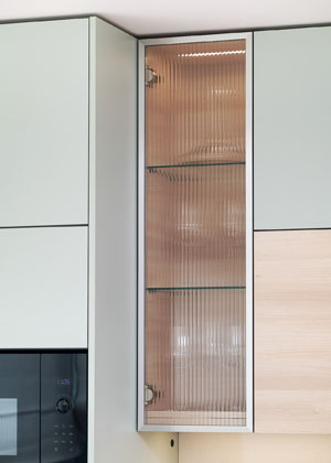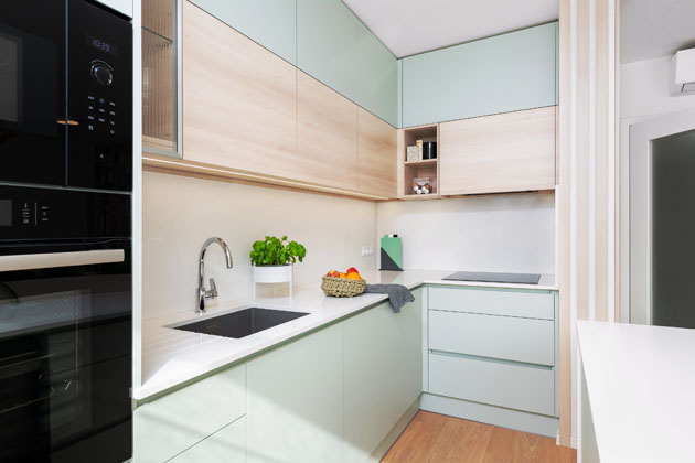 Od developera měli návrh kuchyně s využitím prostoru až do stropu kvůli úložnému prostoru v klasickém provedení bílá v kombinaci se dřevem. Majitelé se ale víceméně v rámci celého bytu rozhodli jít vlastní cestou a vybočit z běžných trendů. S designérkou se shodli na mátově zelenkavém odstínu.