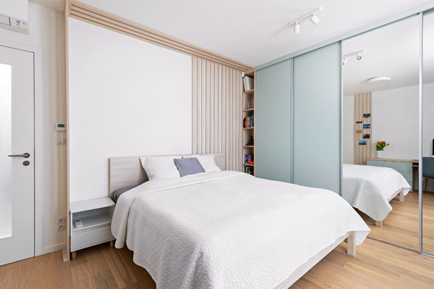 Zajímavý optický prvek představují na míru vyrobené lamely, které interiéru přinesly nejen estetickou, ale i praktickou funkci. Díky průhlednosti umožňují vizuální oddělení jednotlivých zón, aniž by narušily otevřenost prostoru a zároveň skvěle ladí s výmalbou a tapetami. Truhlář je navíc přesně přizpůsobil požadovanému dekoru, takže dokonale doplňují ložnici, předsíň i obývací pokoj.