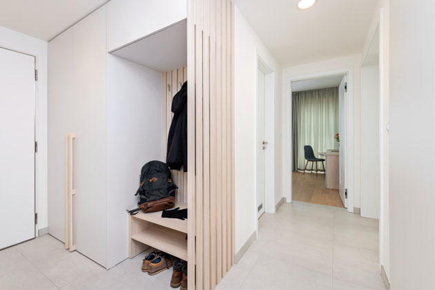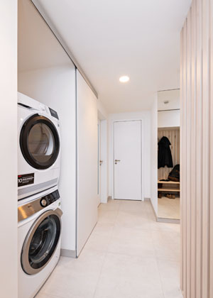 Výklenek na pračku a sušičku, který developer původně naplánoval hned u vchodu, se majitelům nelíbil, protože by to bylo první, co by člověk při vstupu viděl. Designérka proto navrhla řešení s posuvnými dveřmi ve stejném odstínu jako výmalba zdi, které tudíž splývají se stěnou. Výsledkem je čistý a nezahlcený vzhled chodby.