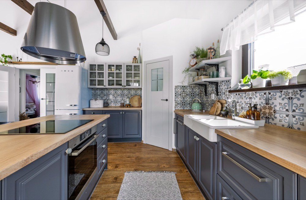 Od začátku jsme věděli, že nechceme dlouhou chodbu, ale jen vstupní chodbu, která díky skříním a botníku vyrobeným na míru a dvoukřídlým dveřím vedoucím do obýváku s kuchyní bude působit jako další obytná místnost. Největší výzvou předsíně se stala stěna z lícových cihel. Lepení se zhostili manžel s mým tatínkem a dokončili ho slovy „větší kravinu sis vymyslet nemohla“. Při výběru interiérových dveří jsme nemohli najít takové, které by odpovídaly našim představám a šly zkombinovat s dveřmi od spižírny, tudíž nám nezbylo než hledat v zahraničí a překročit rozpočet. Stejně tak jsme ochotně čekali, až v Itálii vyrobí božské obklady, které se nejvíce podobaly našim vysněným z cest po Portugalsku, Itálii či Španělsku.