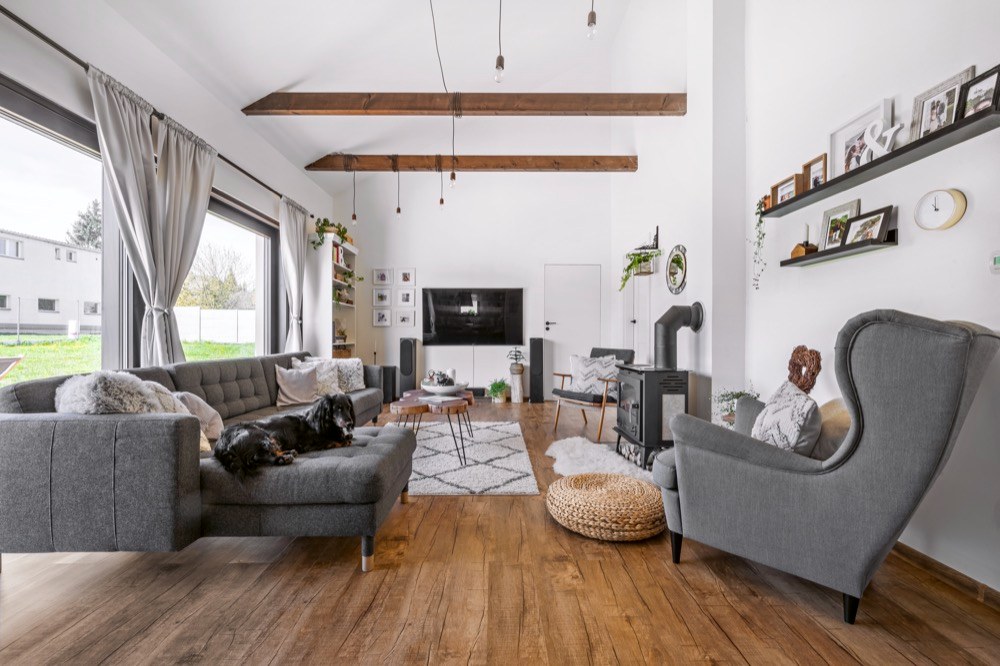 Původně jsme si přáli velký kamenný krb, a jak se říká, papír snese všechno. V původních plánech vypadalo vše ideálně, ale nakonec vzhledem k velikosti krbu ho nebylo možné realizovat, a tak jsme zvolili jiné skvělé řešení v podobě krbových kamen, která v zimě dodávají místnosti útulnost a fungují jako sekundární zdroj vytápění k podlahovému topení. Máme rádi světlo, proto jsme zvolili velká hliníkovo-dřevěná okna, která vzhledem k tomu, že nemáme rádi plasty, byla designovou i finanční výzvou. Co se zařízení týká, asi nejvíce nového nábytku převážně z IKEA máme právě v obývacím pokoji.