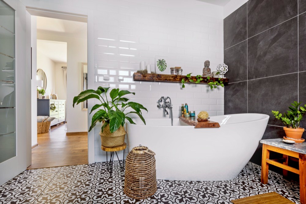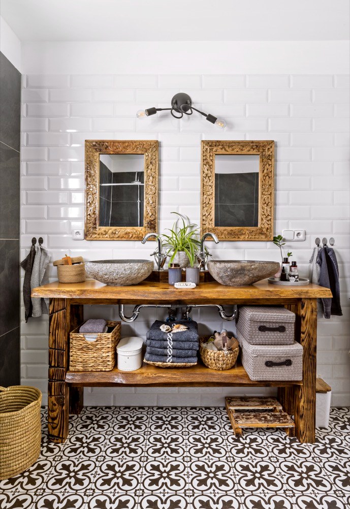 Před lety jsme cestovali po Srí Lance, kde nás v jednom krásném mini hotelu zaujala otevřená sprcha s velkými obklady, a chtěli jsme si trochu té atmosféry přenést i domů. Přáli jsme si volně stojící vanu, ale ne na lvích nožkách, což byla celkem výzva najít pěknou v přijatelné cenové relaci, což se nám nakonec podařilo v SIKO koupelny, odkud máme i obklady a dlažbu. Zkombinovat tzv. metro obklady s velkoformátovými obklady a dlažbou s dekorem patchworku se ukázalo jako velká výzva, ale povedlo se. Dlouhou dobu mi něco chybělo nad vanou, a tak jsme využili další kus dřeva ze stavby jako poličku, je zbroušená, opálená a nalakovaná. Zrcadla v dřevěných rámech manžel sehnal opět přes Marketplace. Umyvadla jsou za pár korun z vidalxl.cz.