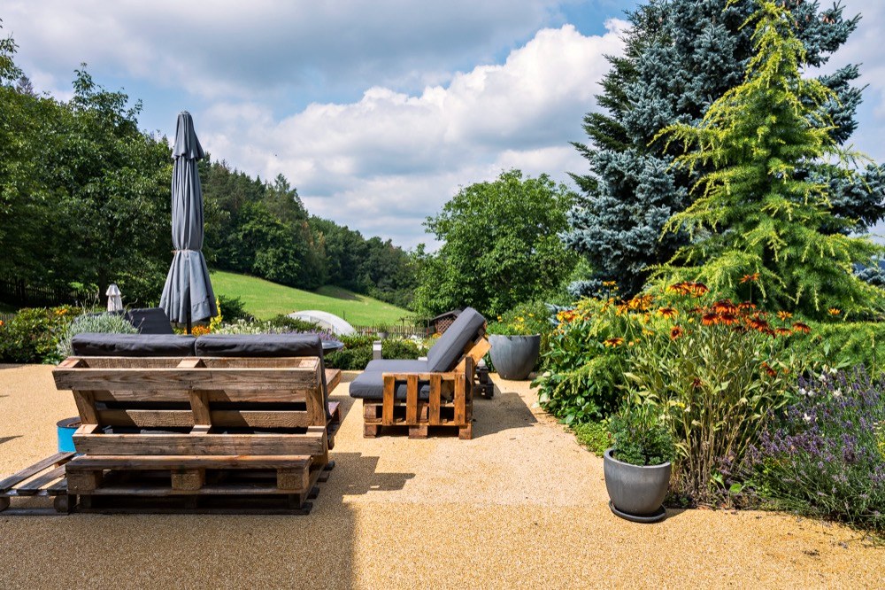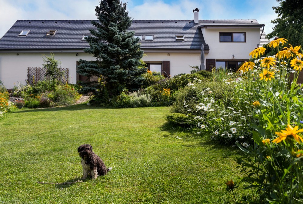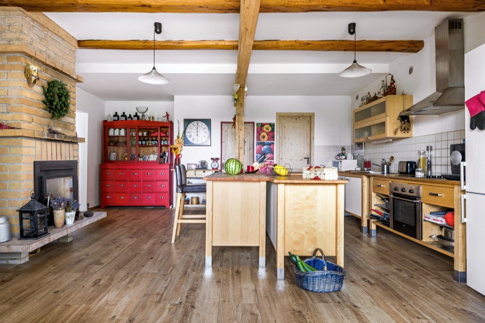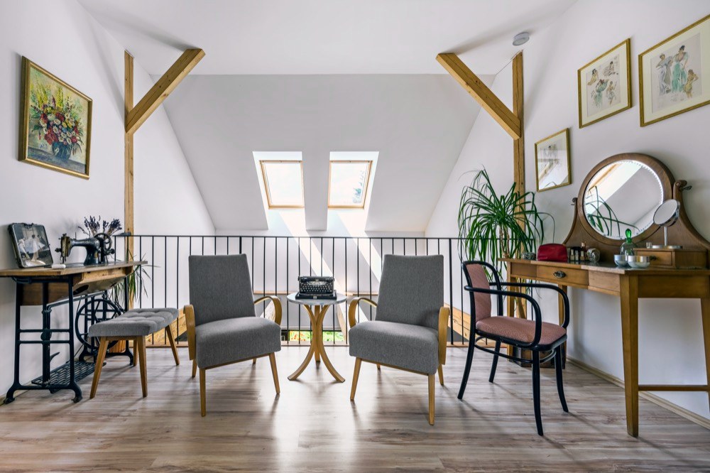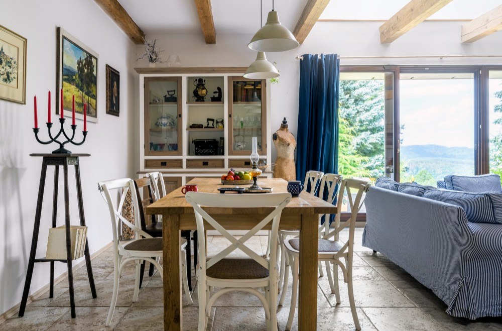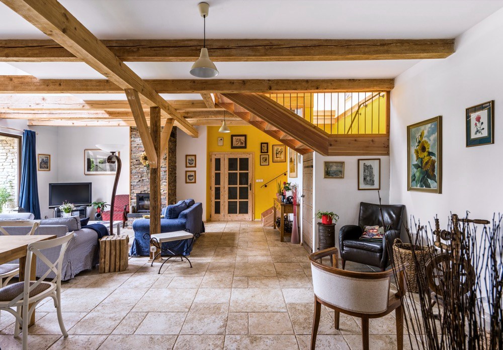 Jakmile mi Martina oznámila, že s manželem koupili starou stodolu, byla mnou lapena. Na „revizní“ návštěvu a focení jsem si sice ještě pár let musela počkat, ale stálo to za to. Tušení, že pod rukama Martiny a jejího francouzského muže Alaina vznikne něco pěkného, mě nezklamalo. Asi tak po třech letech hledání vhodného objektu na víkendové bydlení poblíž Prahy našli manželé inzerát, který nabízel k prodeji starou stodolu. Bylo to sice dál od metropole, ale když se tam přijeli podívat, měli ihned jasno. Uchvátil je výhled do krajiny, klid a také to, že v bezprostřední blízkosti nejsou žádné domy. Dům byl vlastně velká stodola, částečně uzpůsobený k bydlení a částečně sloužil původnímu majiteli jako truhlářská dílna. Oběma novým majitelům bylo předem jasné, do čeho jdou a že to bude chtít hodně práce a peněž, než bude dům podle jejich představ, ale výhled zvítězil...