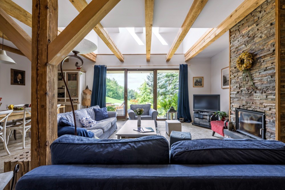 Dokonalé výhledy do krajiny vedly majitele k tomu, aby si koupili starou stodolu, do níž postupně vestavěli svůj nový dům. Víkendové bydlení