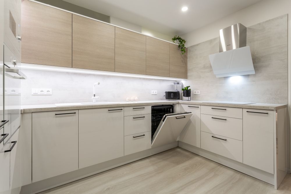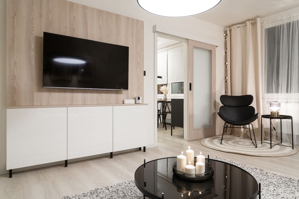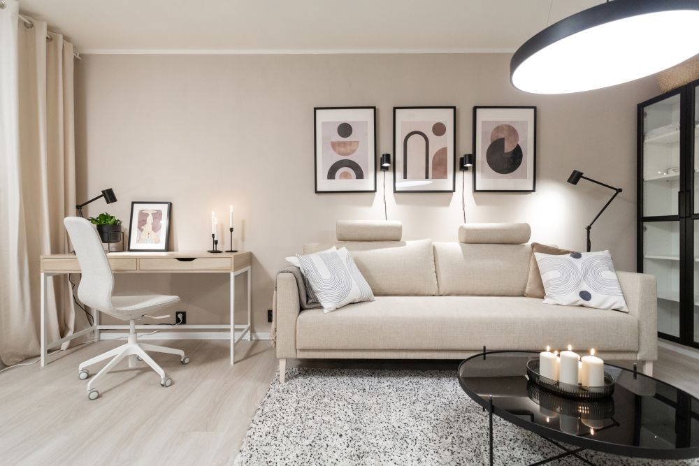 Styl designérky zvolily jako příjemný mix světlého, vzdušného interiéru ve skandinávském stylu s lehce industriálním nádechem, který si současně zachovává jistou míru elegance naznačující, že se jedná o byt samostatně žijící mladé ženy. Podlahu i dveře vybraly ve světlém dřevodekoru, který byt zútulňuje a současně zachovává jeho světlost. Stěny vymalované lomenou bílou působí čistě a teple. V bytě si pohrály s průhledy: pohledy z průchozí kuchyně oběma směry uzavírají stěny v příjemném šedohnědém odstínu, který vytváří působivé pozadí pro plakáty s abstraktními motivy. Kuchyňskou linku a sestavy úložného nábytku navrhly v bílé, která prostor opticky nezatíží.