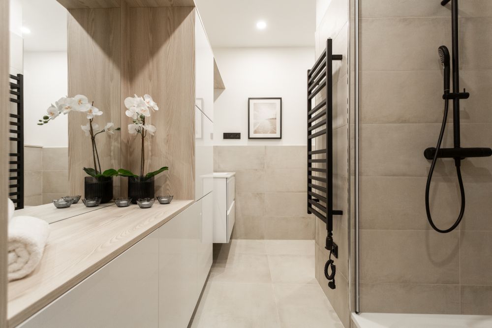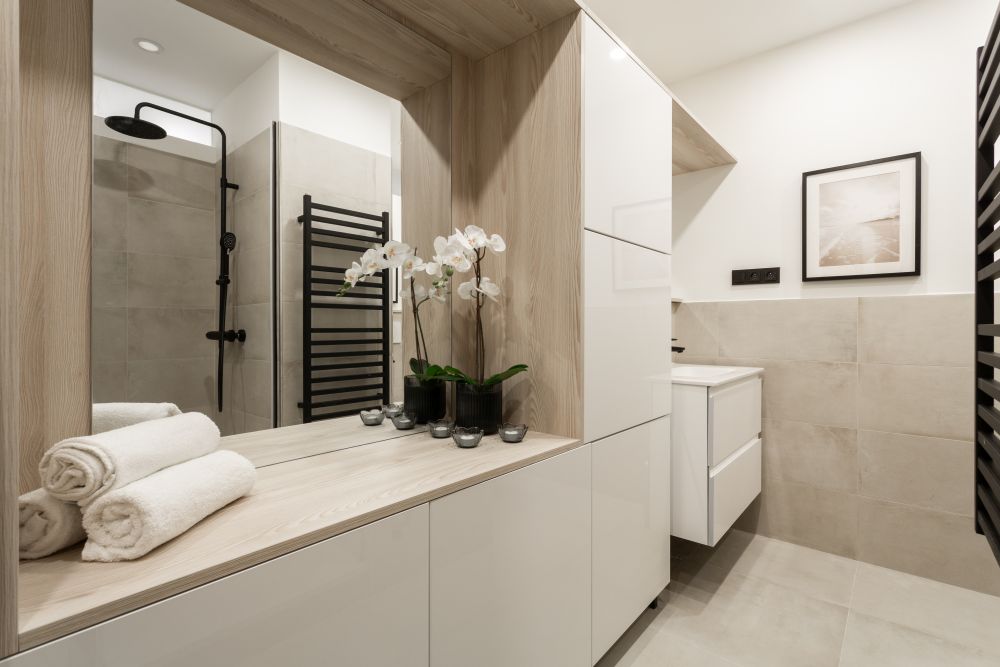 Největší problémy se vyskytly v koupelně. V den, kdy měl obkladač začít obkládat, mu zemřel blízký příbuzný na covid, takže odjel domů na Ukrajinu a už jsme ho neviděly. Další významnou komplikací se ukázaly být obklady, které se štípaly, lámaly a nešly řezat ani lepší řezačkou, pro kterou jsme operativně zajely do půjčovny v Jihlavě. Abychom předešly velkému prořezu, veškerý obklad se nakonec řezal ručně flexou, což nakonec trvalo místo jednoho dne celé tři dny. Poslední obkladačka byla nalepená na stěnu teprve pátý den stavby ve tři odpoledne. Teprve v tu chvíli se na stavbě přestalo prášit a bylo zřejmé, že do půlnoci nezvládneme interiér vyluxovat, vytřít, smontovat nábytek, vybalit doplňky, navrtat obrazy, vyžehlit kilometry záclon a závěsů ani rozmístit dekorace a květiny. Takže koupelna nám nečekaně posunula odevzdání interiéru o jeden celý den. Další z mnoha komplikací byl covid, kterým onemocněl sponzor dodávající dekorativní stěrku. Na dvou stěnách bytu viditelných z kuchyně měla imitovat beton a dodat tak interiéru industriální styl. Poradily jsme si jednoduše a nahradily stěrku tónovanou výmalbou. Mezi významné komplikace patřil zoufalý nedostatek prostoru: rekonstruovaly jsme kompletně celý byt, ve kterém tak nezbýval ani kousek místa, který by se dal využít na skladování materiálu.